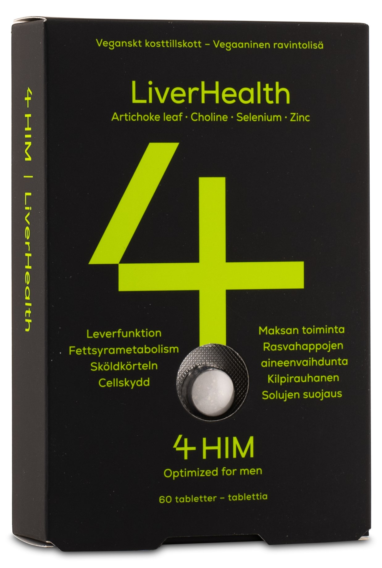 4HIM LiverHealth on erityisesti miehille suunniteltu ravintolisä. Se sisältää koliinia, sinkkiä, seleeniä sekä E, C ja B6 vitamiineja sekä latva-artisokan lehtiuutetta. Koliini tukee normaalia maksan toimintaa ja rasva-aineenvaihduntaa. Sinkki edistää rasvahappojen normaalia aineenvaihduntaa sekä suojaa soluja hapettumisstressiltä yhdessä E- ja C- vitamiinien kanssa. B6-vitamiini edistää proteiinien ja glykogeenin normaalia aineenvaihduntaa, kun taas seleeni tukee kilpirauhasen normaalia toimintaa.