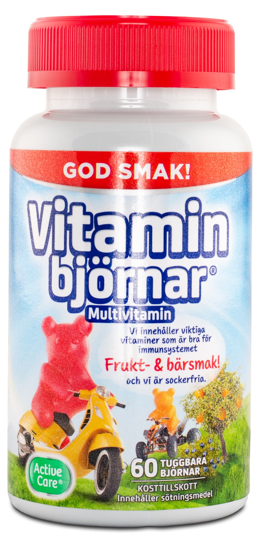 Active Care Vitamiinikarhut ovat maukas ja hauska tapa täydentää päivittäistä ruokavaliota. Vitamiinikarhut maistuvat todella hyvälle, mikä tekee niiden ottamisesta helppoa. Vitamiinikarhut sisältävät kaikki kehon tarvitsemat vitamiinit ja ovat täysin sokerittomia.