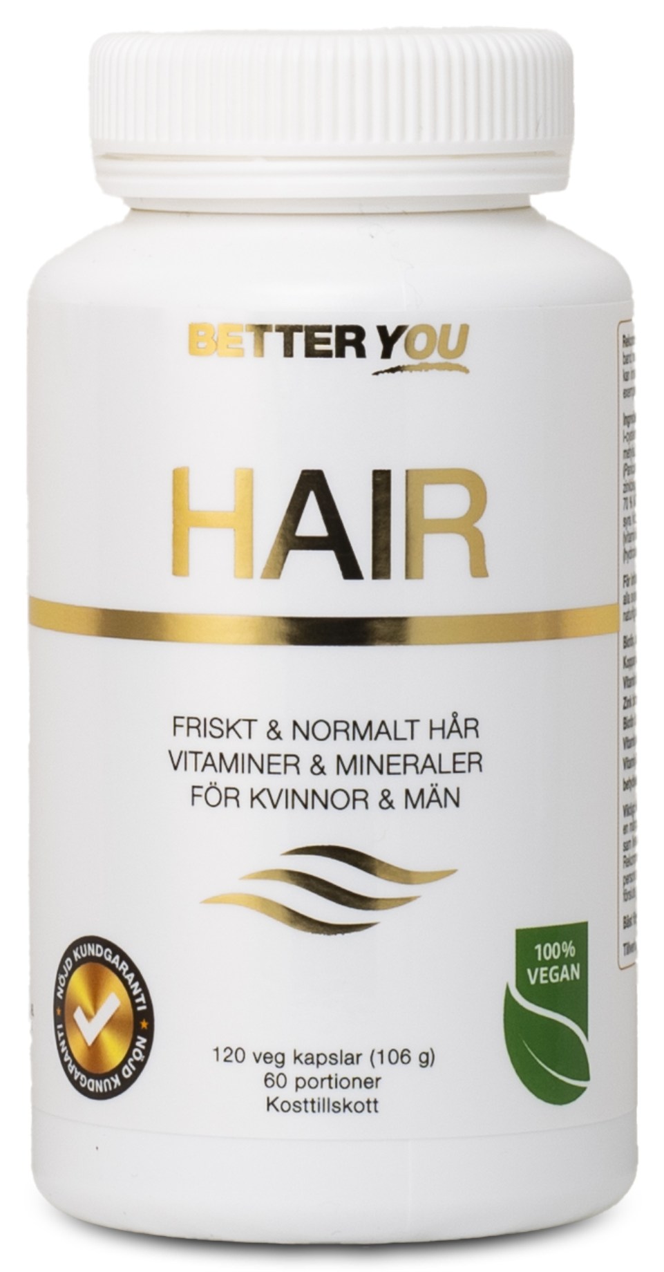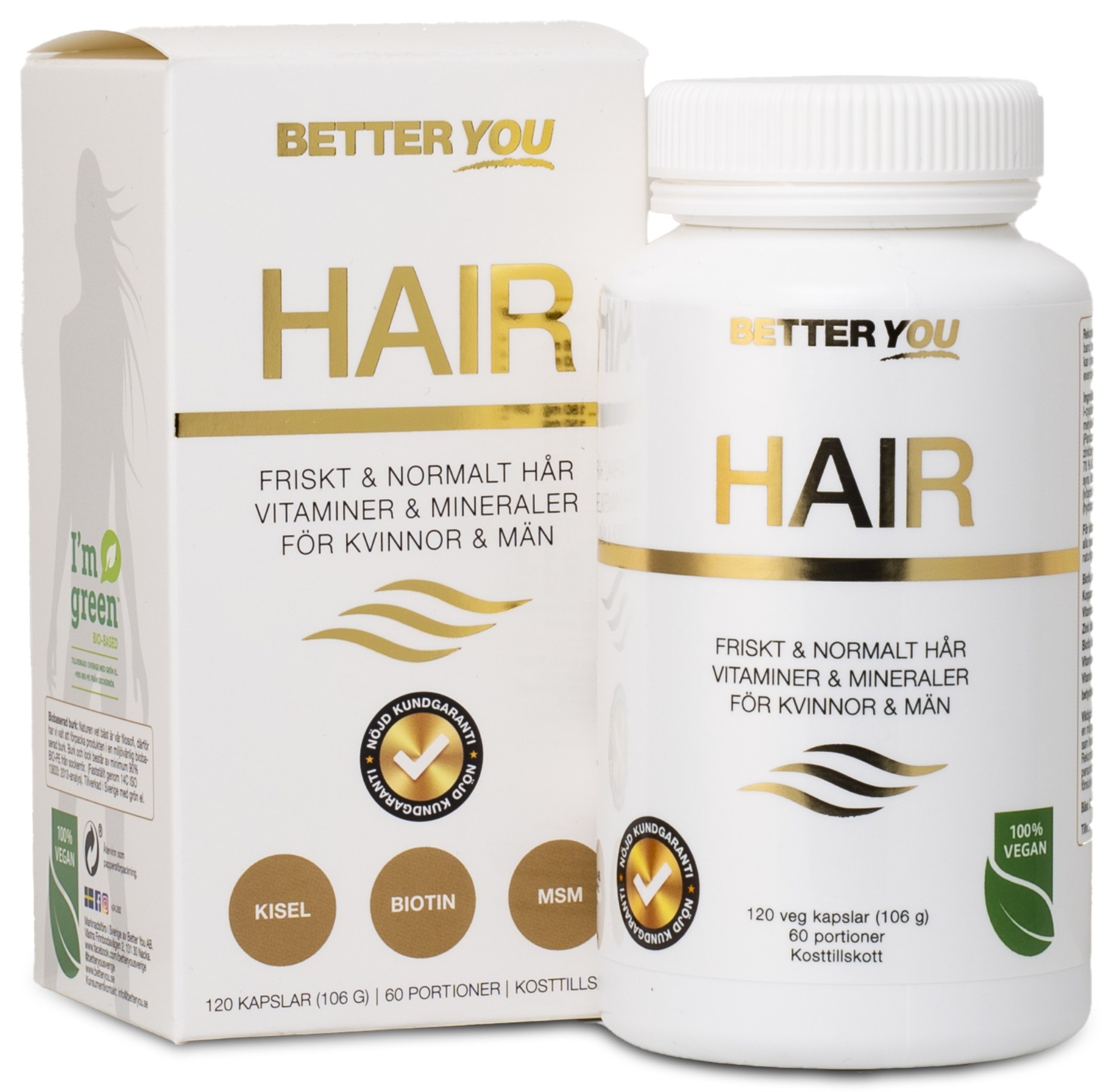 Better You HAIR on ainutlaatuinen ravintolisä, joka auttaa pitämään hiukset terveinä ja vahvoina. Lisäravinne sisältää valikoituja vitamiineja, mineraaleja ja aminohappoja, jotka myötävaikuttavat eri tavoin normaaleihin hiuksiin ja hiuspohjaan. Lisäravinne sisältää muun muassa biotiinia, sinkkiä ja seleeniä, jotka auttavat ylläpitämään normaaleja hiuksia, sekä kuparia, joka edistää hiusten normaalia pigmentaatiota. Se sisältää myös luonnollista rikkiä MSM:n muodossa sekä L-kysteiini-aminohappoa, jotka molemmat ovat hiusten luonnollisia ainesosia. Lisäksi Better You HAIR sisältää täysravinto-uutetta bambusta, joka on luonnostaan runsaasti piitä. Piitä tarvitaan kollageenin muodostamiseen, joka on tärkeä rakennusosa hiuksissa, ihossa ja kynsissä.