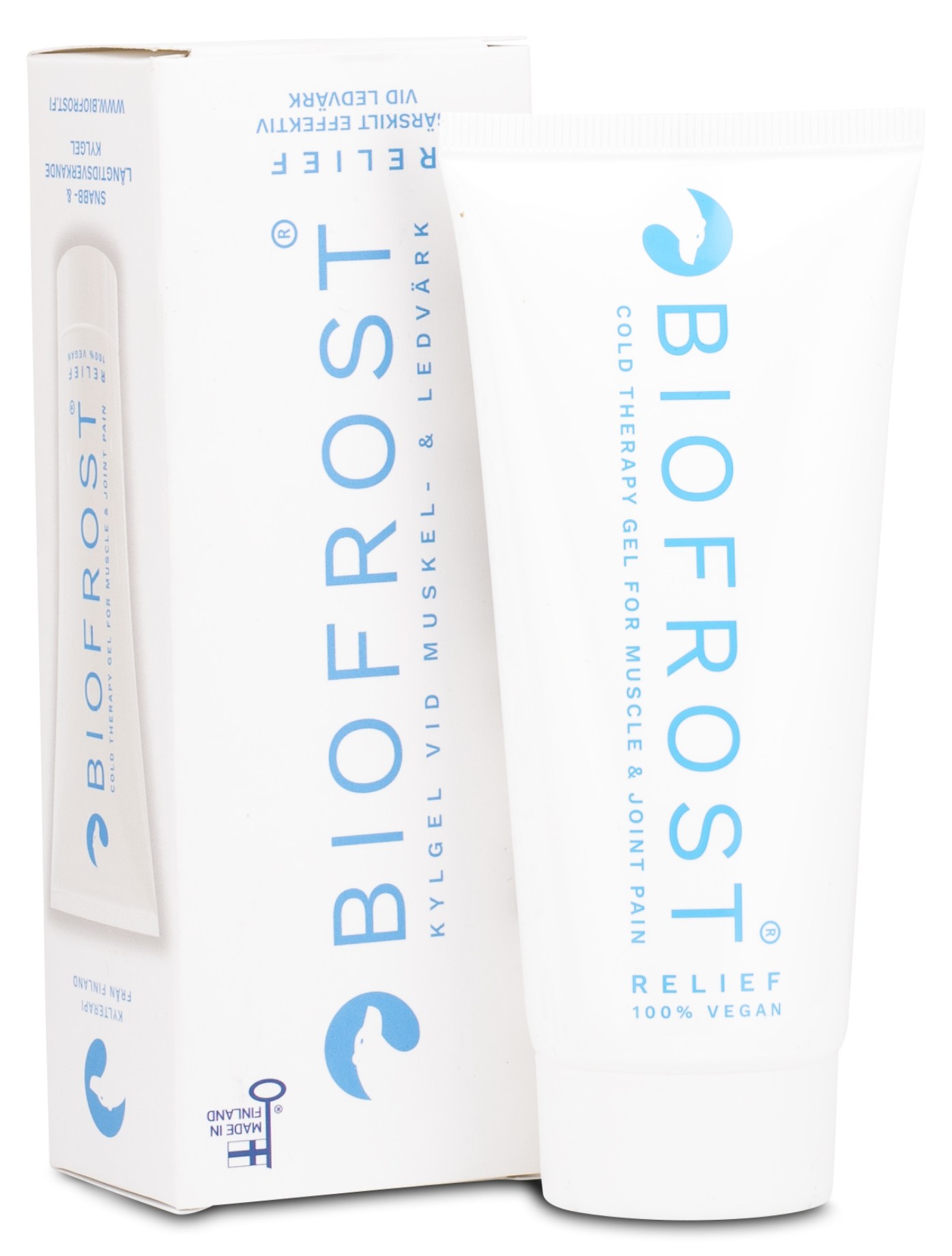 Biofrost Relief -putkilo on tehokas kylmähoito kipeille lihaksille ja jäykkyydestä kärsiville. Sopii erinomaisesti venähdyksiin, nyrjähdyksiin, urheiluvammoihin ja mustelmiin. Biofrost käyttää optimaalista yhdistelmää mentolia, eukalyptusta ja piparminttua kehon lämpötilan alentamiseksi asteittain jopa 7 astetta. Vaikutus kestää jopa useita tunteja. Tämä voi vähentää lihasjännitystä ja nopeuttaa lihasten palautumista.