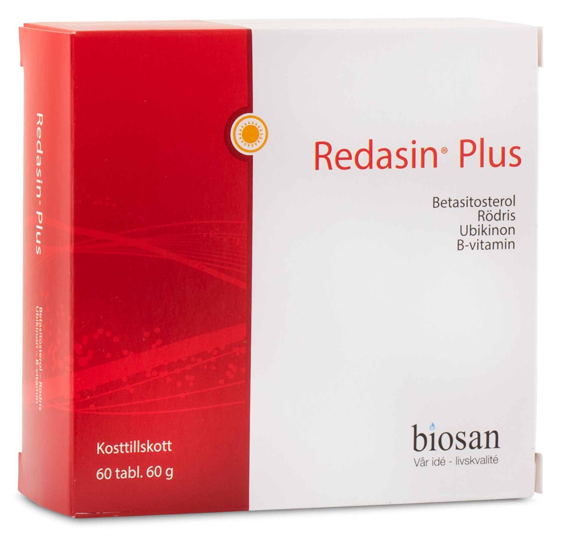 Biosan Redasin Plus on ravintolisä, joka sisältää punariisiä, ubikinonia (Q10), foolihappoa sekä B6- ja B12-vitamiineja ja kasvisteroleja. Q10 on antioksidantti, joka on tärkeä solujen energiantuotannolle. Foolihappo, B6 ja B12 edistävät normaalia homokysteiinin aineenvaihduntaa.