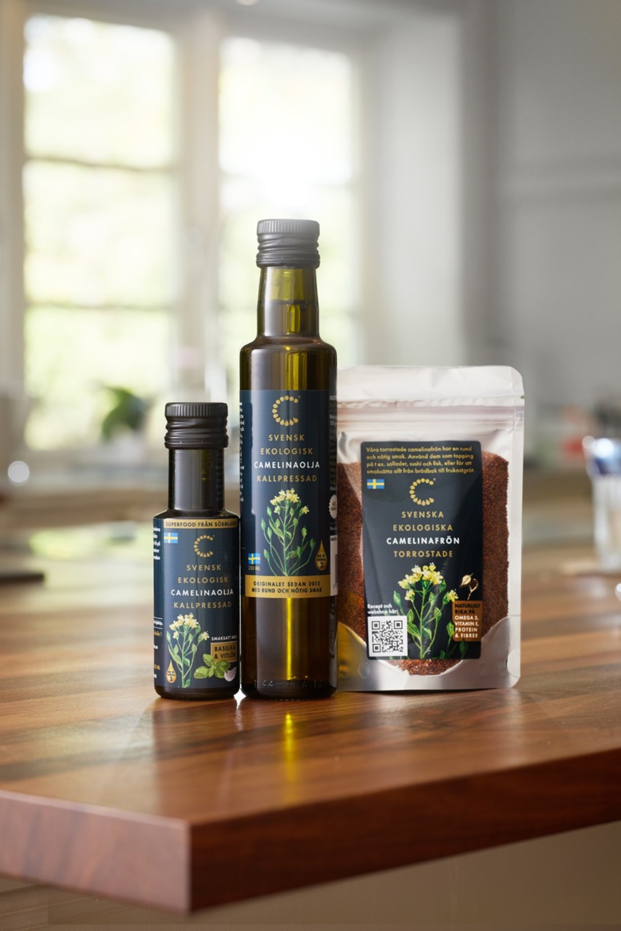 Elävöitä ruokalajisi Camelinaöljy Krav Basilika Valkosipuli -öljyllä! Tämä öljy on maukas vaihtoehto rypsiöljylle, oliiviöljylle tai pellavansiemenöljylle, ja se sisältää hyviä ominaisuuksia. Vain kahdella teelusikallisella päivässä saat päivittäisen omega-3 (ALA) tarpeesi. Öljy soveltuu erinomaisesti ruoanlaittoon ja uunileivontaan sen lämmönkestävien ominaisuuksien ansiosta. Se on myös täydellinen salaatin päälle valeltavaksi tai tuoreen leivän kanssa nautittavaksi. Camelinaöljy on luonnollisesti ravintorikas öljy, joka korostaa makuja!