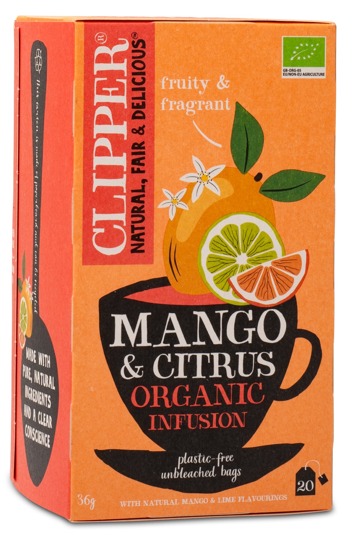 Clipper Tea Mango & Citrus Infusion on herkullinen ja virkistävä tee. Mangon makeuden ja sitrushedelmien raikkaan happamuuden harmoninen yhdistelmä luo maku, joka tuo mieleen kesän. Täydellinen nautittavaksi milloin tahansa päivällä. Tämä tee on luontaisesti kofeiinitonta.