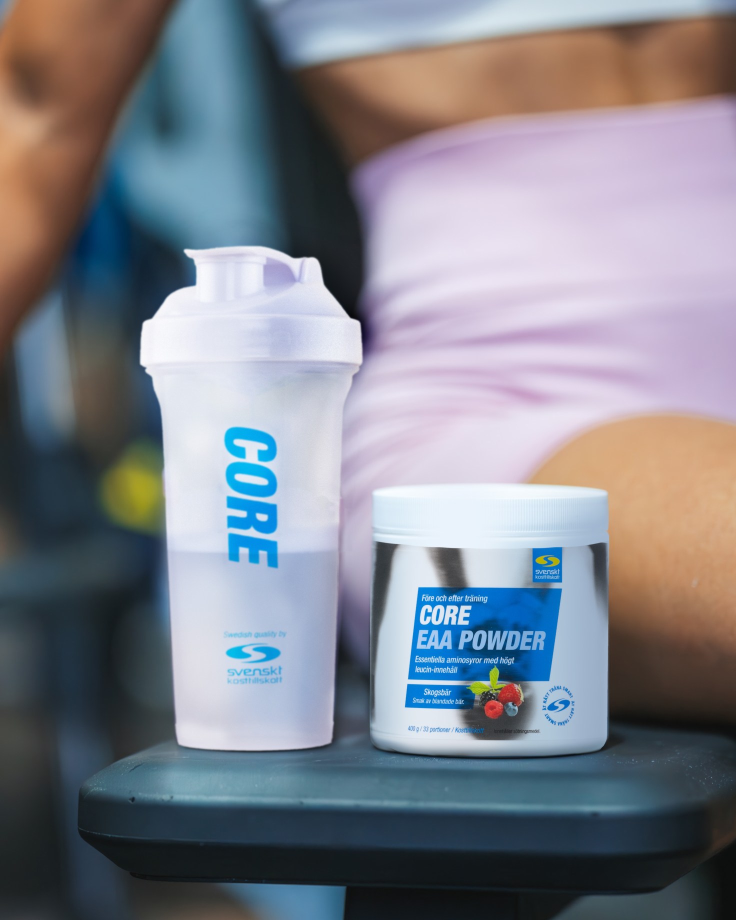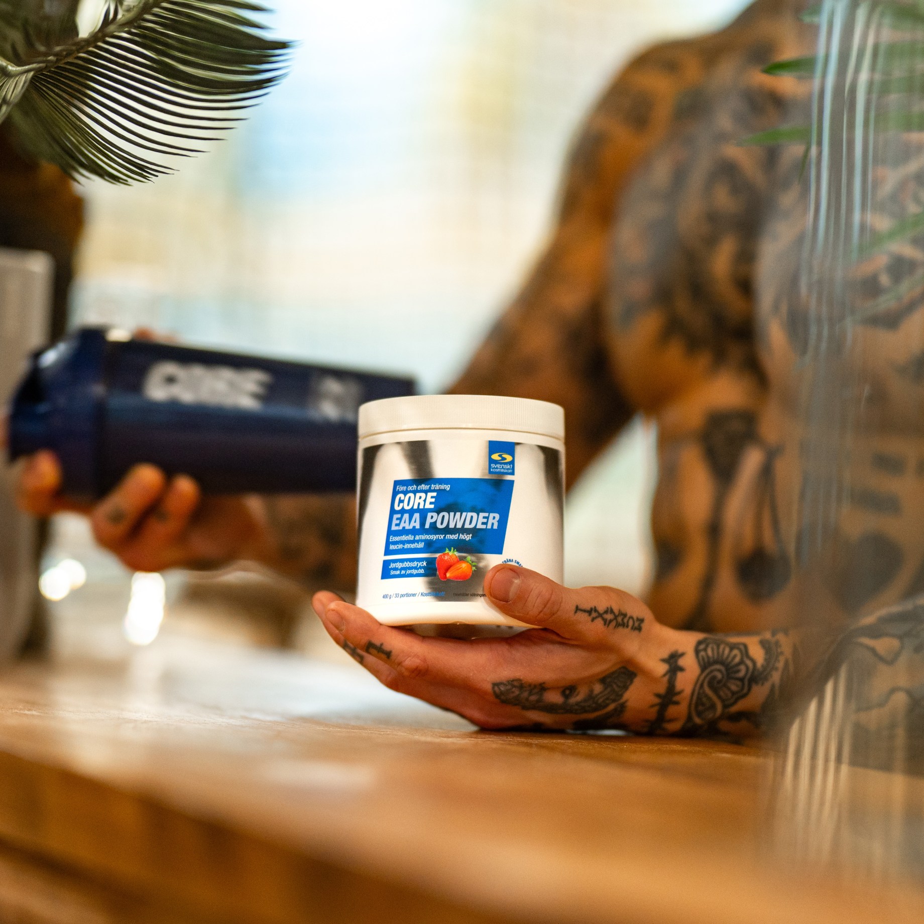 Parhaan mahdollisen vaikutuksen saamiseksi tulisi sinun nauttia EAA tyhjään vatsaa, aikaisintaan kaksi tuntia edellisen aterian jälkeen. Keho ei valikoi erikseen mitä aminohappoja se imeyttää, joten mikäli olet syönyt proteiinipitoista ruokaa, imeytyy se myös. Tämä puolestaan hidastaa EAA:n imeytymistä. Core EAA Powderin nauttiminen tyhjään mahaan ennen treeniä lisää proteiinisynteesiä ja näin ollen uuden lihasmassan rakentumista.