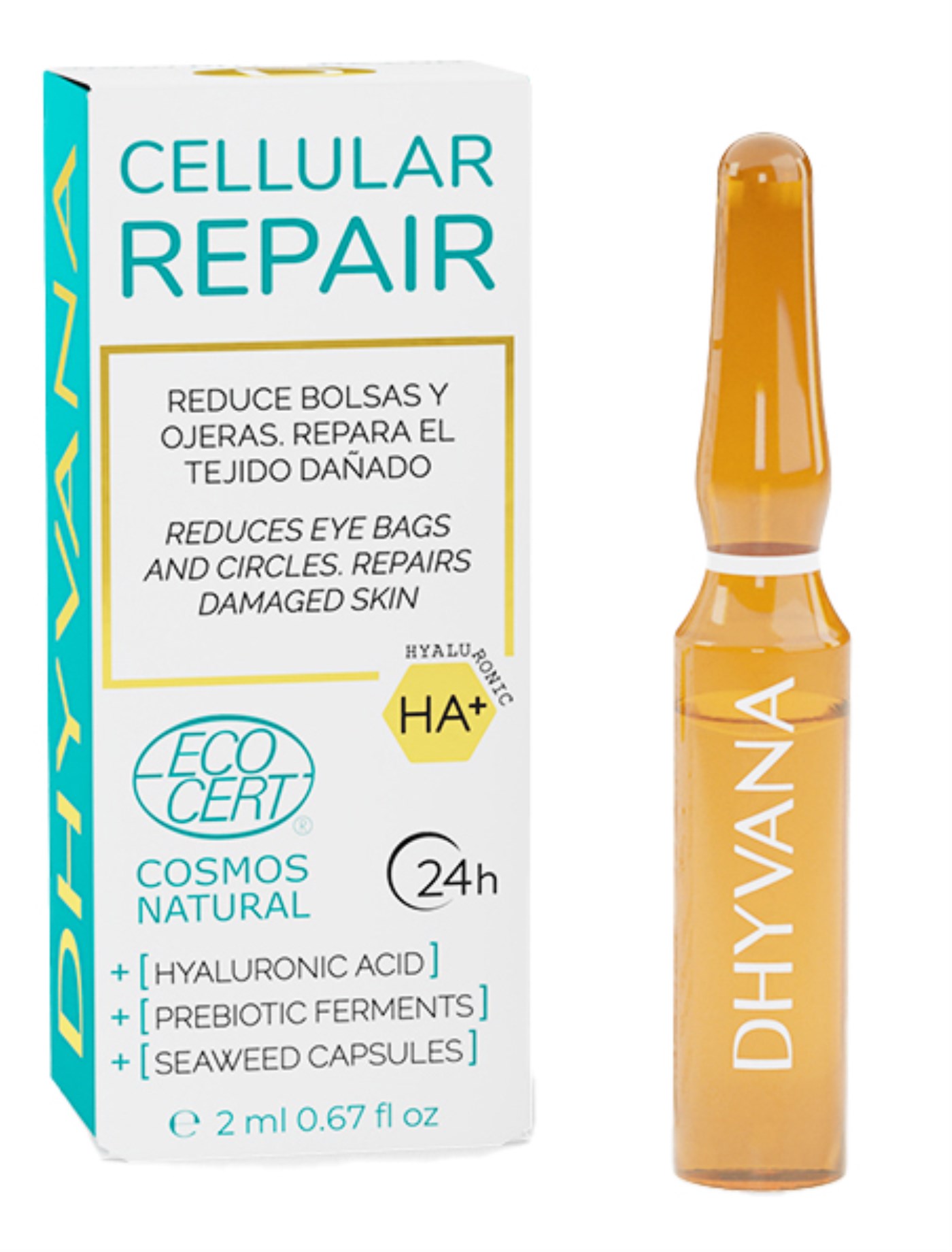 Dhyvana Ampullit CELLULAR REPAIR ovat hyaluronihappo-ampulli, jossa on reishi-prebiootteja, merilevää sisältäviä klorellaa, sekä hoitavia uutteita viinirypäleen siemenöljystä, merilevästä ja E-vitamiinipitoisesta kaakaovoista. Täydellinen sinulle, joka haluat korjata herkkää tai vaurioitunutta ihoa, erityisesti silmien ympärillä. Vahvistaa ihoa ja vähentää tummia silmänalusia. Sisältää myös täyte- ja ryppyjenvastaisen vaikutuksen. Käytä tehohoitona tai pitkäaikaisen tuloksen saavuttamiseksi.