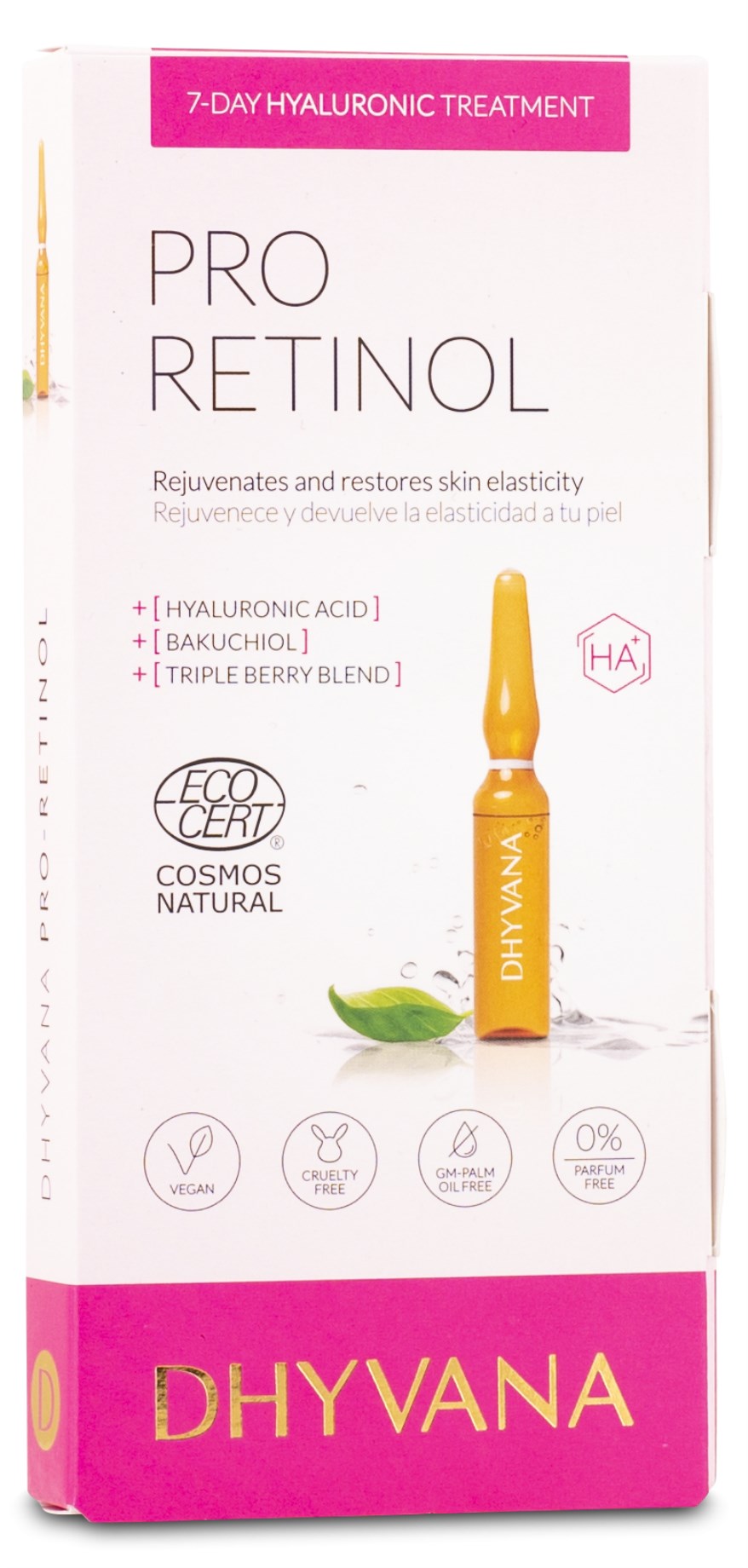 Dhyvana Ampulli PRO RETINOL on hyaluronihappo-ampulli, joka sisältää bakuchiolia - luonnollista vaihtoehtoa synteettiselle retinolille. Lisäksi tuotteessa on uutetta ginkgo bilobasta, punaviinirypäleistä ja acai-marjoista. Yhdessä nämä ainesosat uudistavat ja nuorentavat ihoa sekä poistavat ihon epätasaisuuksia - tuotteella on voimakas anti-aging vaikutus ilman negatiivisia sivuvaikutuksia! Tuote tarjoaa myös "täyteainevaikutuksen". Tämä tuote on täydellinen sinulle, jos ihosi on ikääntynyt tai vahingoittunut. Käytä intensiivihoidossa tai pitkäaikaisessa käytössä.