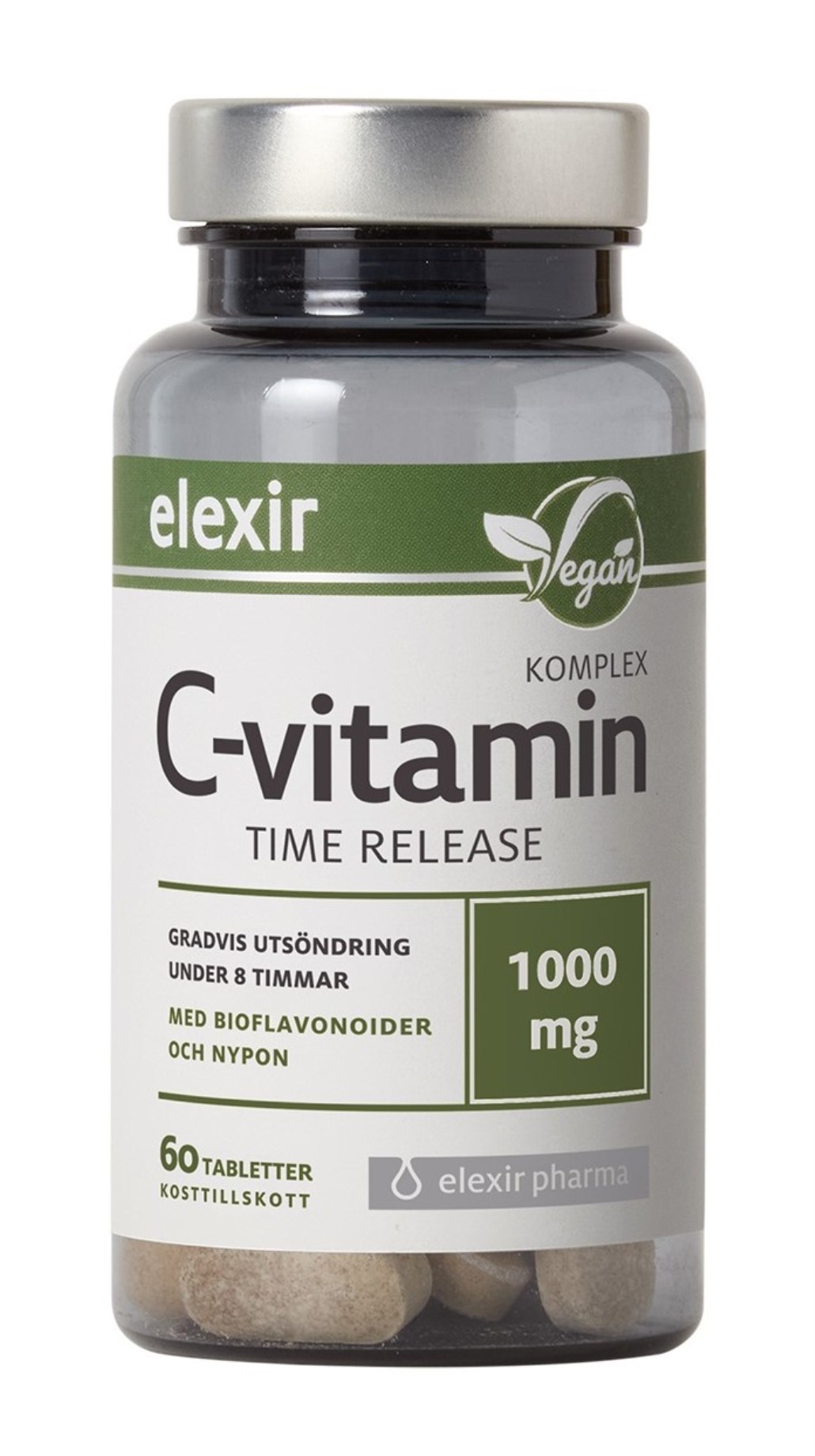 C-Vitamin Komplex Time Release Elexir Pharmalta sisältää 1000 mg mikrogranuloitua C-vitamiinia tablettia kohden. Lisäravinne tarjoaa hitaan C-vitamiinin vapautumisen jopa 8 tunnin ajan. C-vitamiini toimii antioksidanttina, joka auttaa ylläpitämään normaalia immuunijärjestelmän toimintaa ja suojaa soluja oksidatiiviselta stressiltä. Se myös edistää raudan imeytymistä, normaalia kollageenin muodostumista sekä tukee luuston, ruston ja hampaiden normaalia toimintaa. Tämä tuote on hellävarainen vatsalle ja sisältää sekä bioflavonoideja että ruusunmarjajauhetta.