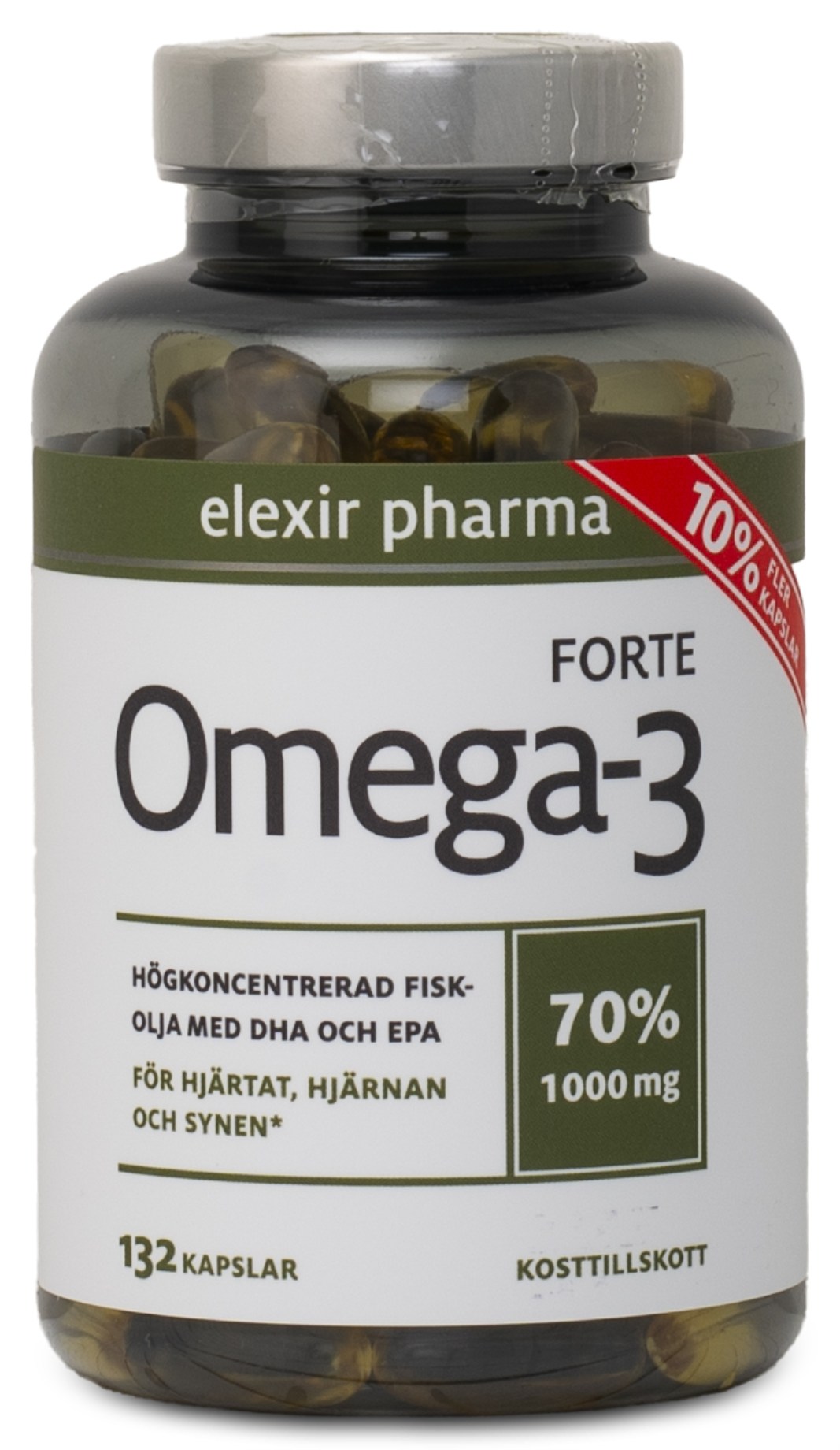 Elexir Pharma Omega-3 Forte on laadukas, vahva kalaöljy, jossa jokainen kapseli sisältää 70 % omega-3:a. Se on peräisin kestävästi hoidetuista anjovis-, silli- ja makrillikannoista Etelä-Amerikan rannikolla. Korkea omega-3-rasvahappojen pitoisuus tarkoittaa, että riittää, kun otat vain yhden kapselin päivässä saadaksesi suositellun päivittäisen omega-3-annoksen. Elexir Pharma Omega-3 Forte sisältää runsaasti omega-3-rasvahappoja EPA:a ja DHA:ta triglyseridimuodossa, jotka tukevat sydämen normaalia toimintaa ja DHA tukee lisäksi aivojen normaalia toimintaa sekä normaalin näön säilymistä.