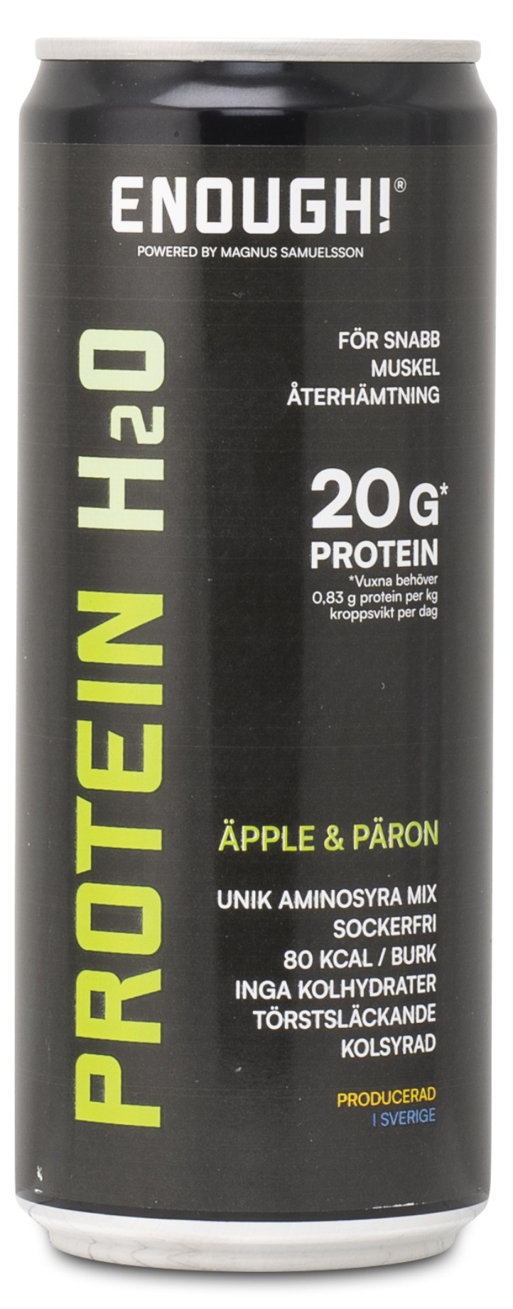 Magnus Samuelssonin Proteiinivesi Enoughilta on vähäkalorinen tuote, joka sisältää 20 grammaa proteiinia. Mukana on välttämättömät aminohapot leusiini, valiini, isoleusiini, treoniini, lysiini, fenyylialaniini, metioniini ja histidiini. Välttämättömät aminohapot ovat sellaisia, joita keho ei pysty itse tuottamaan. Näiden lisäksi se sisältää myös glutamiinia, glysiiniä, tauriinia, sitrulliinia ja alaniinia. Proteiinivesi on täydellinen juotavaksi niille, jotka haluavat polttaa rasvaa tai keskittyä lihasten kehittämiseen. Valmistettu Ruotsissa.