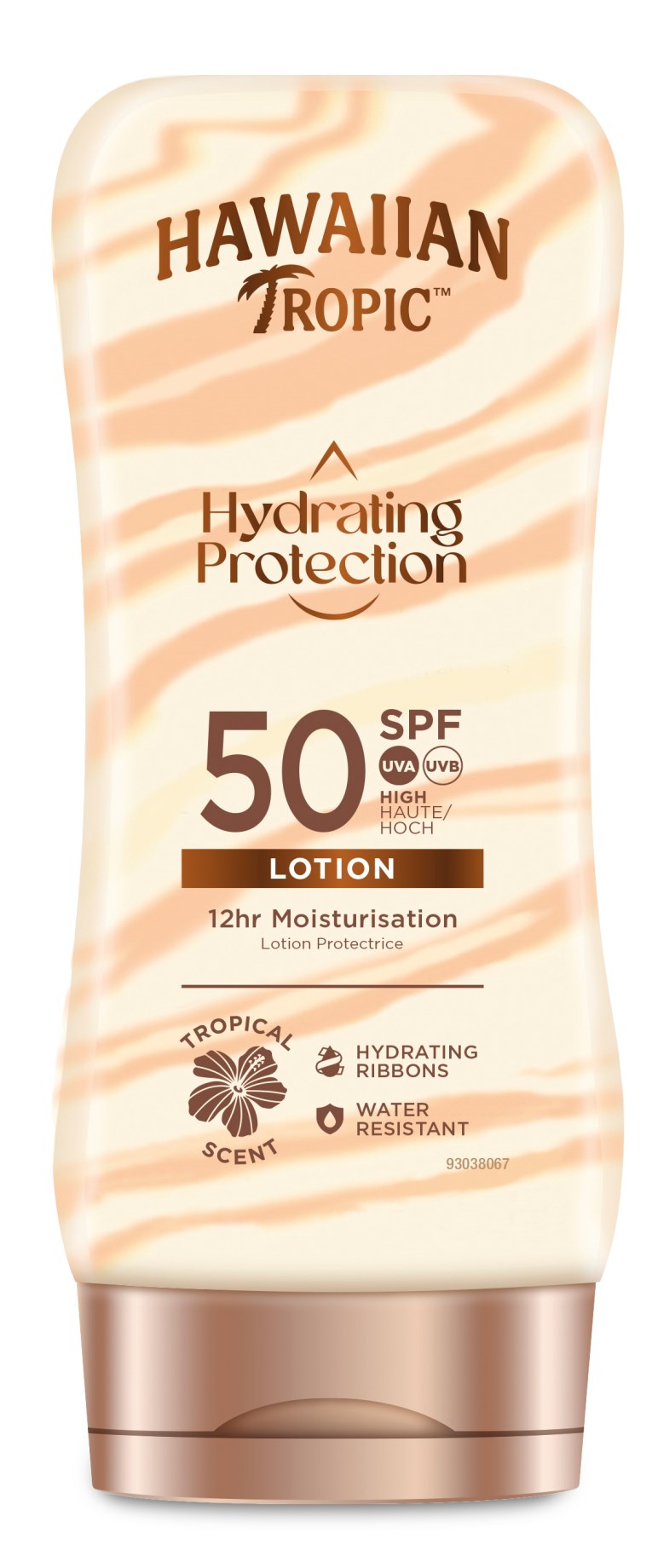 Hawaiian Tropic Hydrating Protection Lotion sisältää silkkiproteiinia, joka hoitaa ja kosteuttaa ihoasi erityisen paljon tämän aurinkosuojan avulla. Kevyt aurinkovoide imeytyy nopeasti ihoon ja antaa silkinpehmeän tunteen.