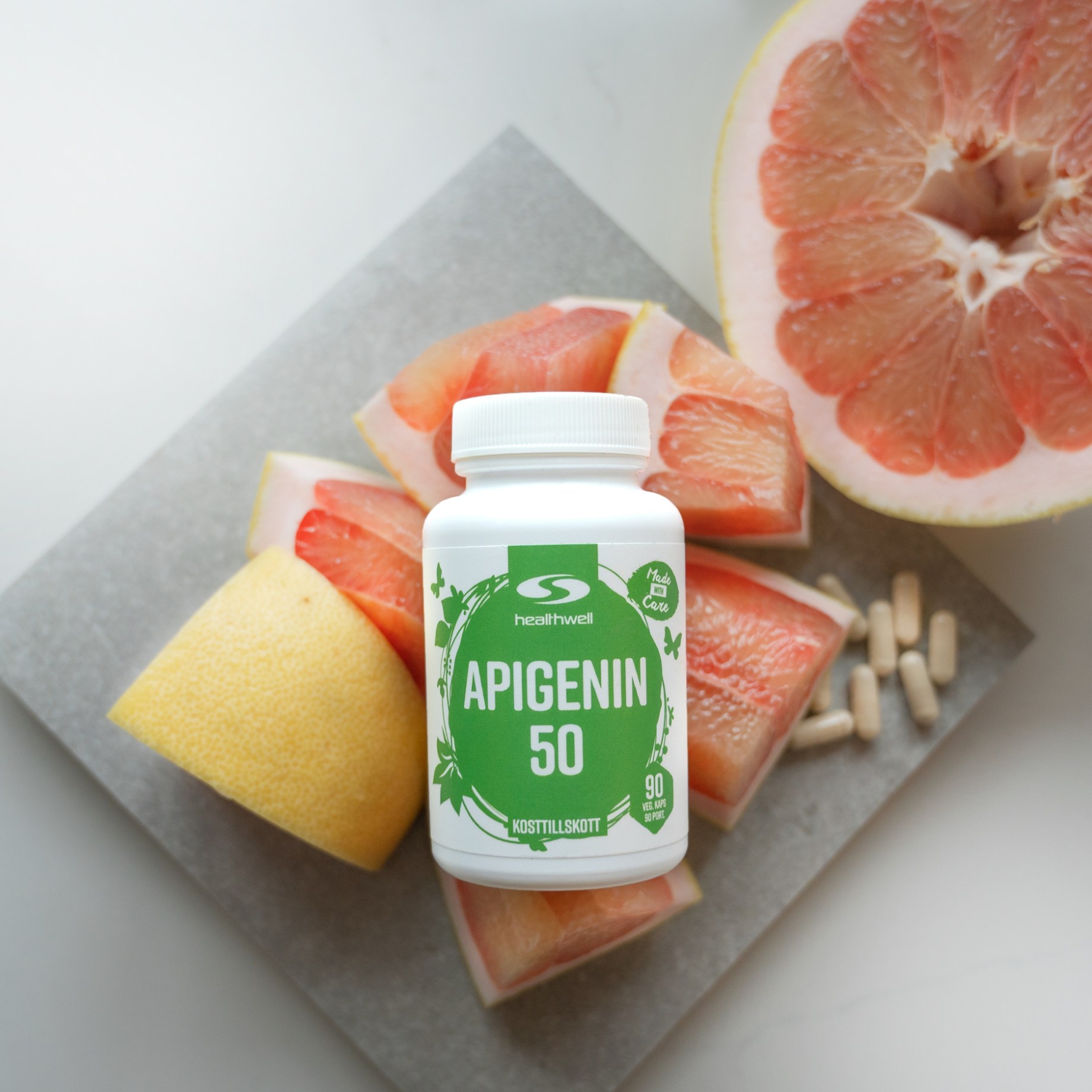 Healthwell Apigenin 50 on lisäravinne, joka sisältää apigeniiniuutetta sitrushedelmästä pomelosta. Apigeniini on voimakas flavonoidi, joka toimii muun muassa antioksidanttina. Flavonoideilla on runsaasti mielenkiintoisia ominaisuuksia, ja niitä on tutkittu laajasti solujen puolustusmekanismeihin liittyen. Apigeniinin on havaittu sitoutuvan GABA-A-reseptoreihin, mikä tarkoittaa, että se vuorovaikuttaa kehon viestinvälitysjärjestelmän kanssa tavalla, joka liittyy rentoutumiseen. Tällä ravintoaineella on pitkä historia kiinalaisessa perinteisessä lääketieteessä, mutta viime aikoina sen suosio on kasvanut myös länsimaissa, kiitos lisääntyneiden lupaavien tutkimustuloksien.
