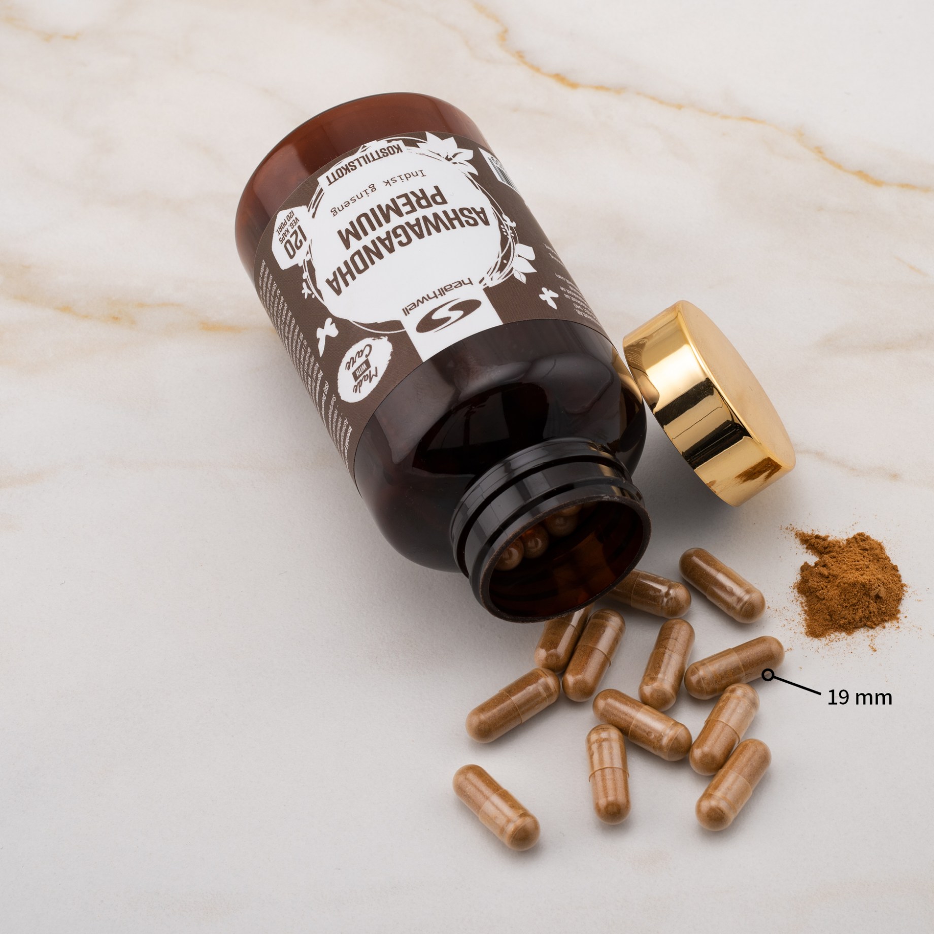 Ashwagandha Premium on kapseleita, jotka sisältävät 500 mg ashwagandhaa per kapseli. Tämä voimakas koostumus on suunniteltu tukemaan henkistä ja fyysistä hyvinvointiasi, erityisesti stressaavina aikoina (1). Kapselit ovat erityisen vahvoja ja sisältävät kahden tehokkaan uutteiden yhdistelmän optimaalisen vaikutuksen aikaansaamiseksi. Ensimmäinen ainesosa on 300 mg juurijauheuutetta ashwagandhan juuresta (Withania somnifera), joka on laajakirjoista korkeapitoista uutetta, joka säilyttää kaikki yrtin luonnolliset osat. Toinen ainesosa on 200 mg uutetta, joka on standardoitu sisältämään 5 % withanolideja, mikä on erityisen voimakas uute juuresta. Ashwagandha Premium sisältää myös piperiniä, joka edistää aktiivisten aineiden imeytymistä.