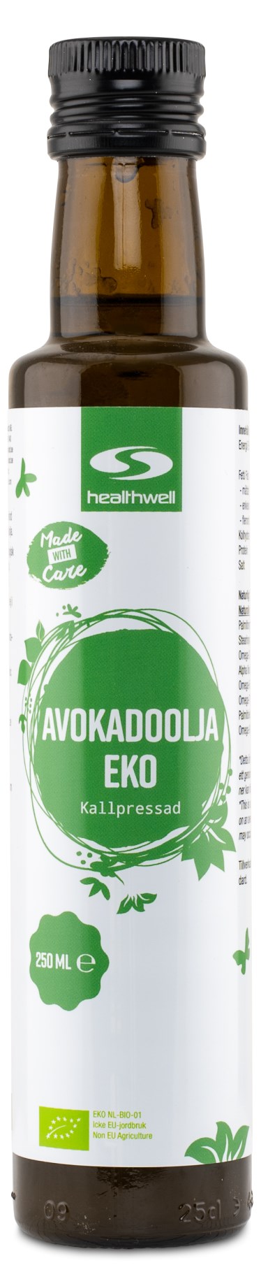 Healthwell Avokadoöljy EKO tulee ekologisesti viljellyistä avokadoista (Persea gratissima) Keniasta. Avokadot kylmäpuristetaan, mikä säilyttää avokadojen tärkeät ravintoaineet lopputuotteessa. Öljy pakataan tummaan lasipulloon, mikä pitää sen tuoreempana pidempään ja estää härskiintymistä.