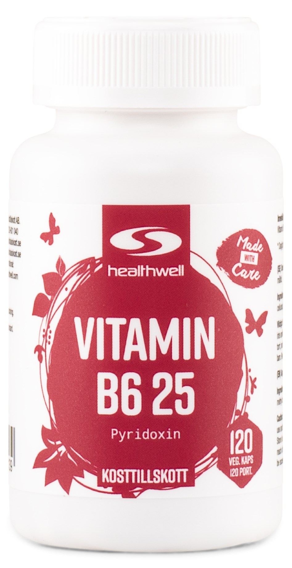 Healthwell Vitamin B6 25 on kasvipohjainen ravintolisä, joka sisältää 25 milligrammaa helposti imeytyvää B6-vitamiinia per kapseli. B6-vitamiini, joka tunnetaan myös nimellä pyridoksiini, on vesiliukoinen vitamiini, joka on tärkeässä roolissa kehon energiankierrossa, edistää hormonien säätelyä ja auttaa vähentämään väsymystä ja uupumusta. Ota yksi kapseli päivittäin aterian yhteydessä osana tasapainoista ja terveellistä ruokavaliota.
