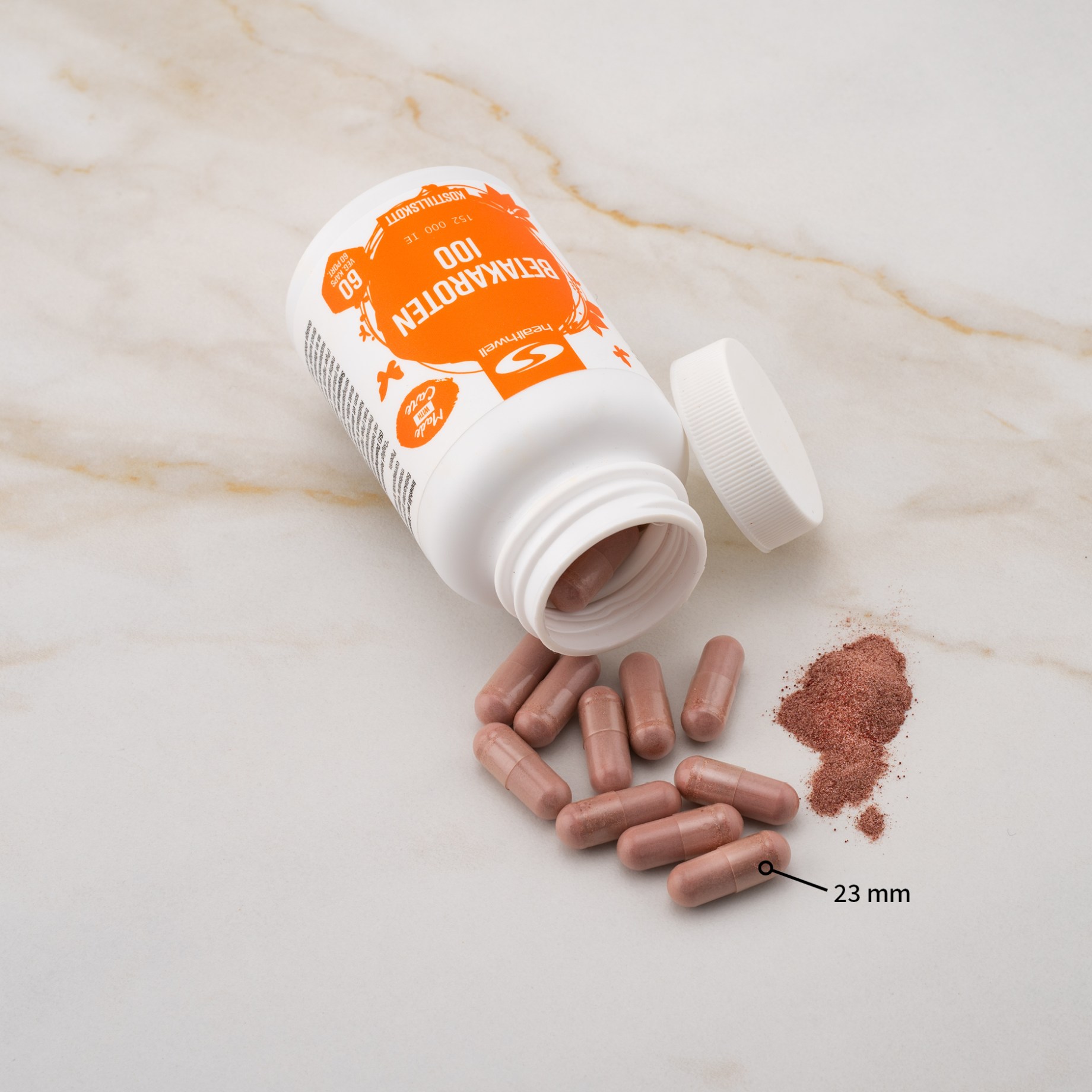 Healthwell Betakaroteeni 100 on ravintolisä, jota esiintyy luonnollisesti Blakeslea trispora -sienessä. Jokainen kapseli sisältää peräti 100 mg beetakaroteenia vastaten 152 000 IU esiaste-A-vitamiinia. Kehon imeytymisen helpottamiseksi on lisätty MCT-öljyä kookoksesta ja mustapippuriuutetta.