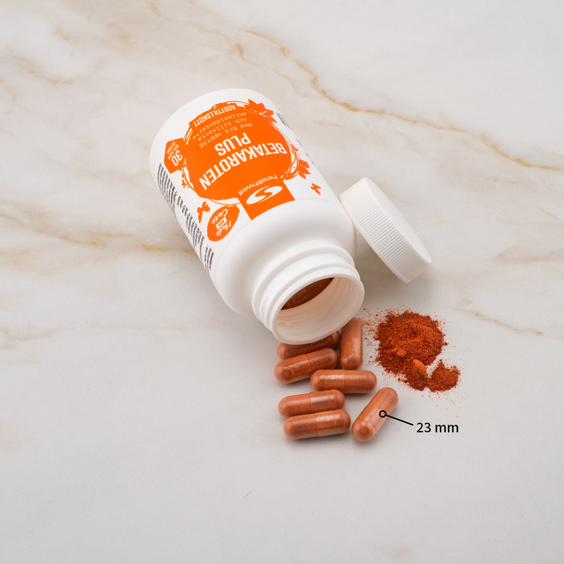 Beetakaroteeni Plus on peräisin Blakeslea trispora -sienestä, mikä antaa sille erinomaisen hyötyosuuden verrattuna synteettisiin vaihtoehtoihin ja tekee siitä terveellisemmän beetakaroteenilähteen. Beetakaroteeni on rasvaliukoinen, joten sen optimaaliseen imeytymiseen tarvitaan rasvaa. Siksi Beetakaroteeni Plus sisältää MCT-öljyä parantaakseen imeytymistä. Imeytymisen lisävahvistukseksi tuote sisältää myös piperinia mustapippuriuutteesta.