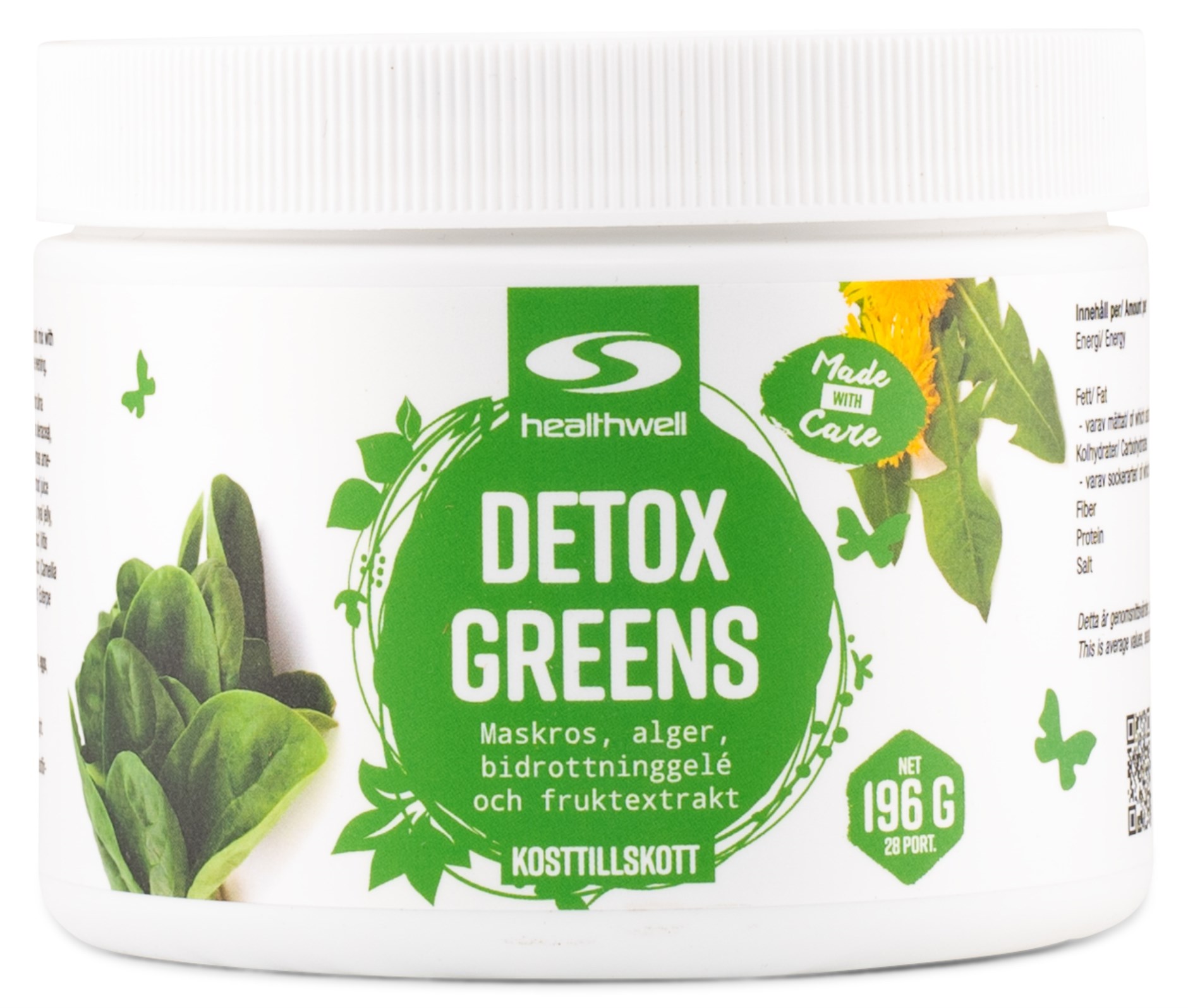 Healthwell Detox Greens on täysin luonnollinen tuote, jossa jokainen annos vastaa suurta määrää hedelmiä ja vihanneksia. Sitä voidaan käyttää detox-kuurin aikana tai lisänä päivittäiseen ruokavalioosi. Detox-kuuri kestää yleensä 7-14 päivää ja sen tarkoituksena on poistaa kuona-aineita kehosta tai antaa terveellisemmän elämäntavan alkusysäys. Joskus lyhyt 2-3 päivän detox viikonlopun ja runsaan ruoan ja herkkujen jälkeen voi olla hyödyllinen, auttaakseen kehoa ja mielen tasapainoa.