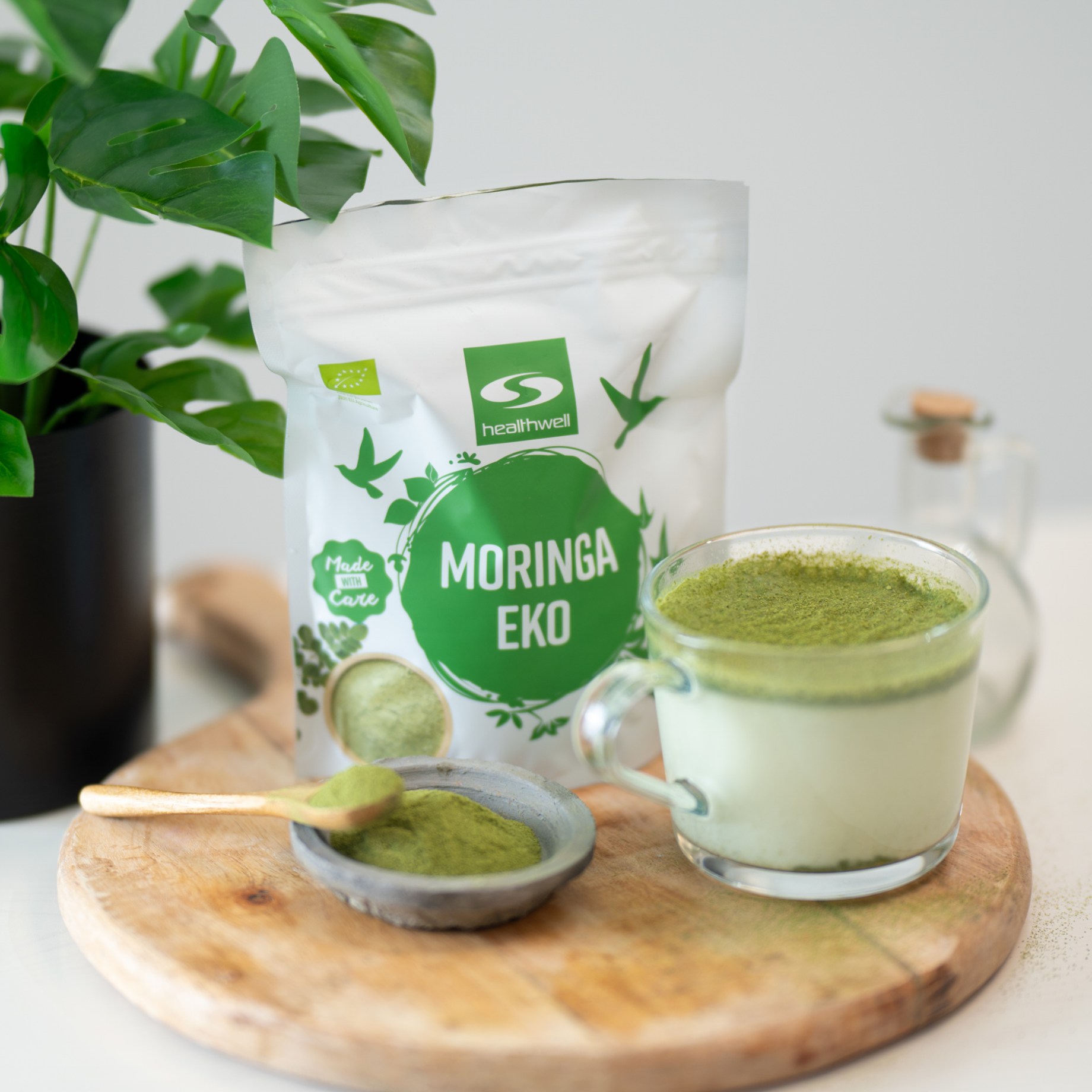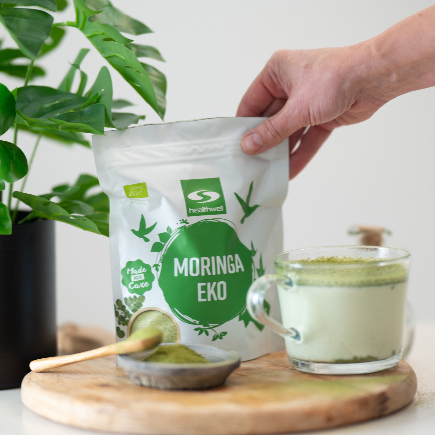 Healthwell Moringa Luomu on jauhe, joka on valmistettu ravinteikkaasta moringakasvista (Moringa oleifera), jota kutsutaan myös "ihmepuuksi" sen rikkaan ravintosisällön vuoksi. Moringa on täynnä aminohappoja, antioksidantteja sekä useita tärkeitä mineraaleja ja vitamiineja. Tämä hienoksi jauhettu jauhe on helppo sekoittaa veteen, teehen tai terveelliseen smoothieen. Moringalla on vaaleasta keskitumman vihreään vaihteleva väri ja ainutlaatuinen, kevyesti mausteinen maku, joka muistuttaa piparjuurta.