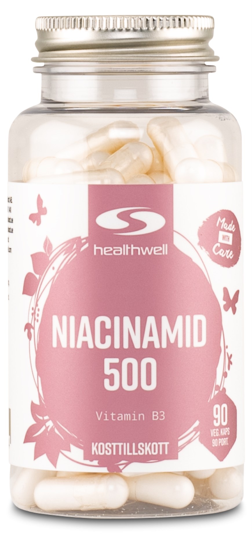 Anna lisähuolenpitoa hiuksillesi, ihollesi ja kynsillesi Healthwell Niacinamid 500:lla, kapseleilla, jotka sisältävät niacinamidia, B3-vitamiinin muotoa. Niacinamidi on yleinen ainesosa kauneustuotteissa, sekä sisäiseen että ulkoiseen käyttöön, ja tunnettu monista positiivisista vaikutuksistaan, kuten normaalin ihon edistämisestä.