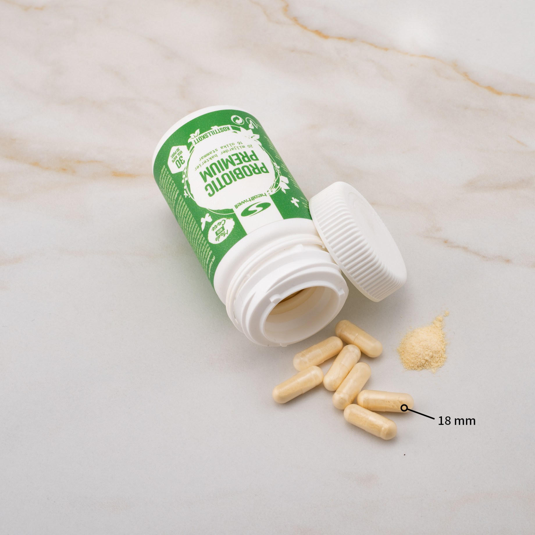 Healthwell Probiotic Premium sisältää yhdistelmän 20 miljardia maitohappobakteeria 16 eri bakteerikannasta kapselia kohden, mukaan lukien yleisimmät kannat, kuten lactobacillus, bifidobakteerit ja streptokokit. Näillä bakteerikannoilla on hieman erilaiset ominaisuudet ja ne toimivat eri tavoin suolistossa. Ne voivat myös toimia yhdessä positiivisella tavalla. Lisäravinne, joka sisältää monia erilaisia maitohappobakteereja, antaa sinulle mahdollisuuden hyödyntää erilaisten bakteerien ominaisuuksia hyvällä tavalla.