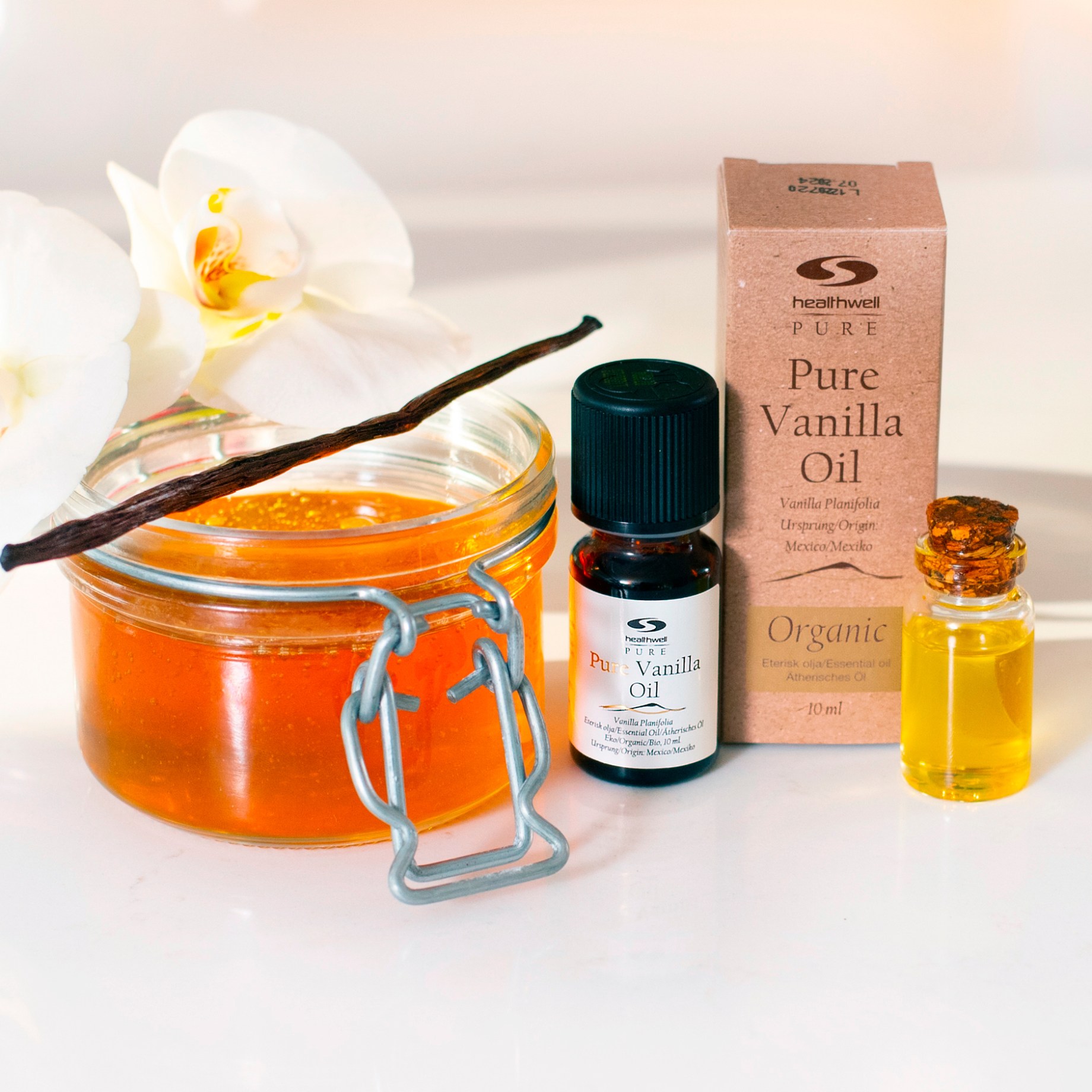Healthwell PURE Vaniljaöljy EKO on eteerinen öljy, jossa on ihana ja makea vaniljan tuoksu. Öljy on erittäin tiivistetty ja sisältää vain puhdasta öljyä, mikä tekee siitä erittäin tehokkaan. Riittää, että annostelussa käytetään vain yhtä tai paria öljytippaa useimmissa käyttökohteissa, mikä tekee öljystä pitkäkestoisen ja edullisen. Healthwell PURE Vaniljaöljy EKO on erinomainen käytettäväksi aromaterapiassa, tuomaan rauhallinen ja miellyttävä tunne, ihanan vartalovoiteen kanssa tai sekoitettuna kasvo- tai vartaloöljyyn.