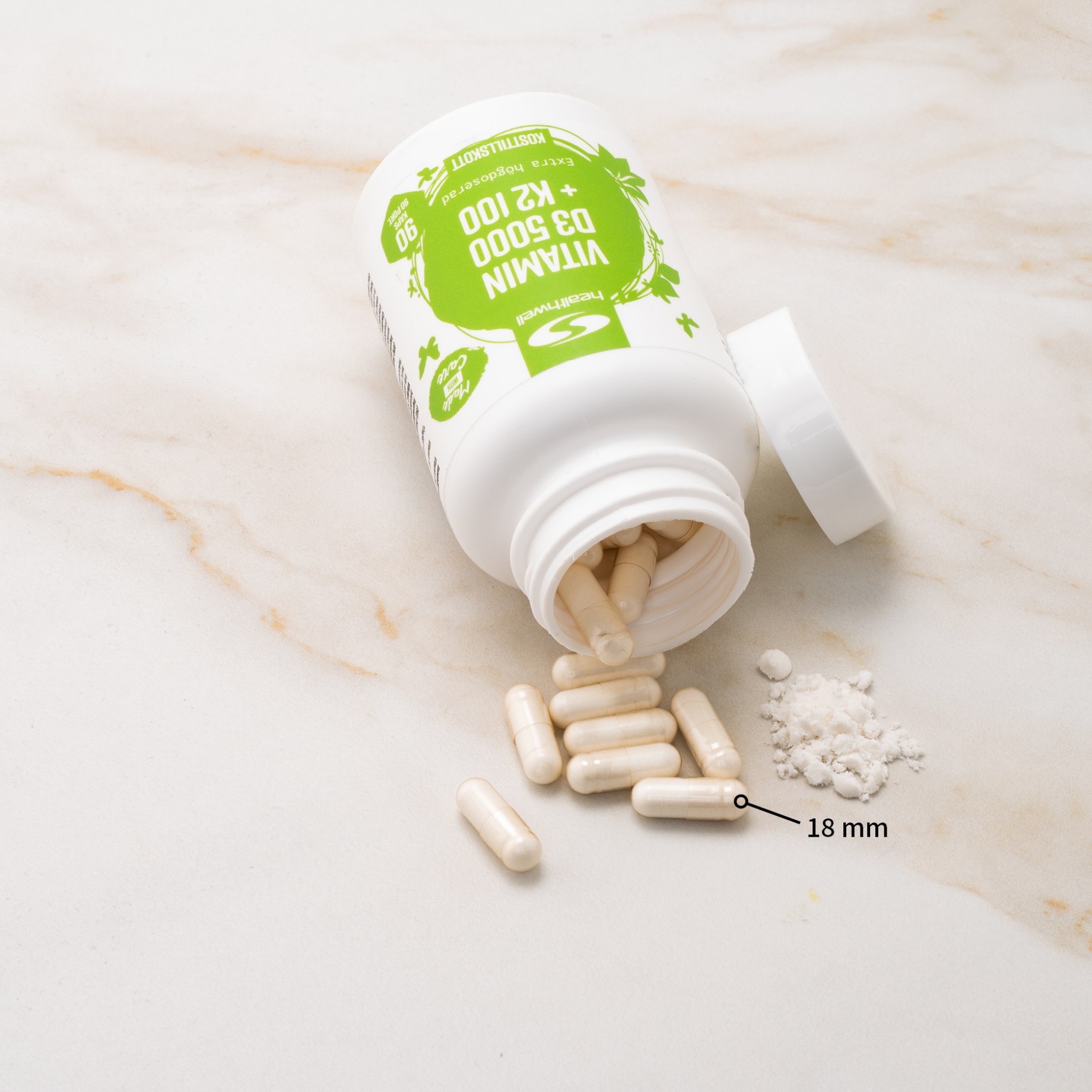 Healthwellin Vitamin D3 5000 + K2 100 on meidän kaikkein tiivistetyn suurannoksinen D-vitamiini, yhdistettynä K-vitamiiniin. Talvikuukausina voi monille olla haaste saada tarpeeksi D-vitamiinia, joten optimaalisten tasojen varmistamiseksi lisäravinteesta voi olla hyötyä. D-vitamiini edistää sekä immuunijärjestelmän toimintaa että vahvan luuston säilyttämistä. Se helpottaa myös kalsiumin imeytymistä. K-vitamiini puolestaan säätelee, miten kalsiumia käytetään elimistössä. Yhdistelmä on hyödyllinen korkeilla D-vitamiinitasoilla optimoimaan kalsiumin hyödyntämistä.