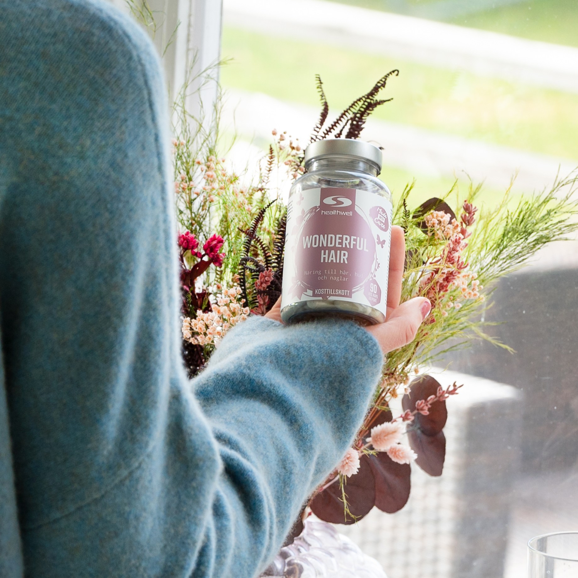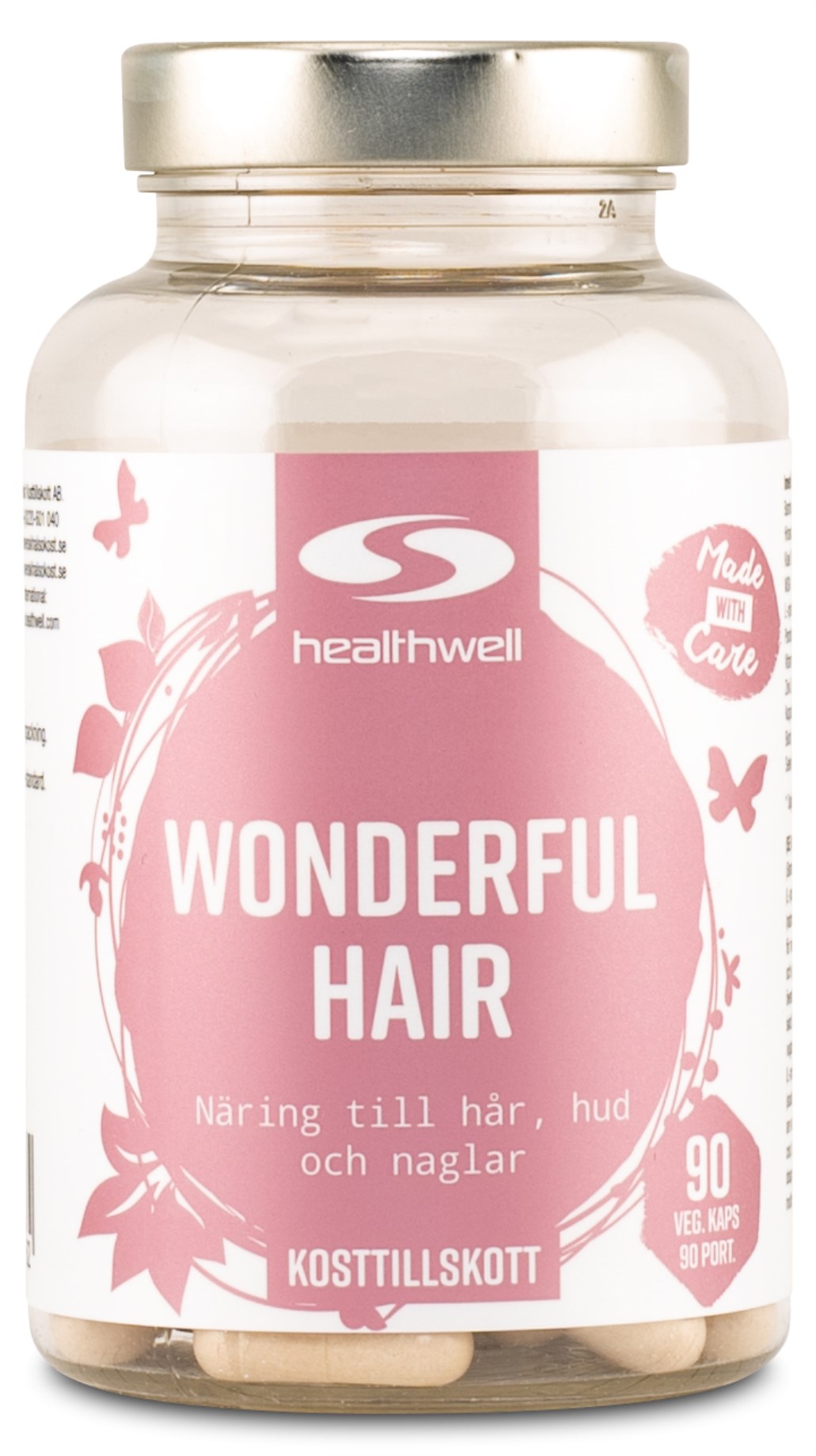 Wonderful Hair Healthwelliltä on huolellisesti koottu sekoitus vitamiineja, kivennäisaineita ja luonnollisia kasviuutteita, jotka antavat hiuksillesi runsaasti ravintoaineita sisältä ja ulkoa. Tuote sisältää muun muassa hirssiuutetta, joka on tunnettu luonnollisesti korkeasta ravintoaine- ja piipitoisuudestaan. Lisäksi tämä tuote sisältää MSM:ää, biotiinia, seleeniä ja sinkkiä; ravintoaineita, jotka tunnetusti auttavat ylläpitämään terveen hiuskunnon.