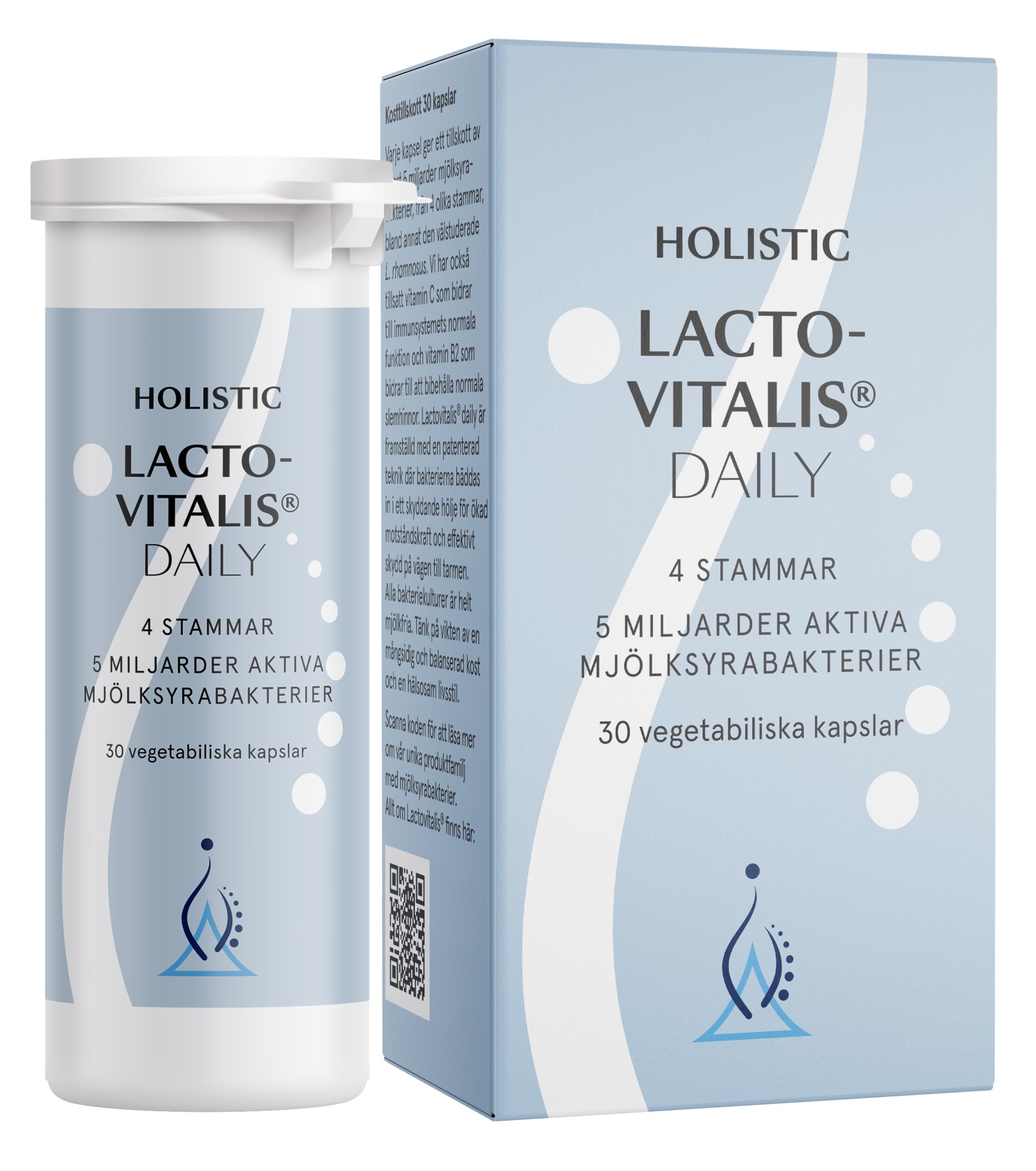 Holistic Lactovitalis Daily on ravintolisä, joka sisältää maitohappobakteereja neljästä eri tarkasti tutkitusta bakteerikannasta, vähintään viisi miljardia bakteeria per kapseli. Jokaisella kannalla on omat erityispiirteensä, jotka täydentävät toisiaan edistääkseen tervettä ja tasapainoista suolistoflooraa. Lactovitalis Daily sisältää myös FOS:ia (frukto-oligosakkarideja), joka on eräänlainen kuitu, joka luo suotuisan ympäristön hyödyllisten bakteerien kasvulle ja toiminnalle suolistossa. Lisäksi Lactovitalis Daily on rikastettu C-vitamiinilla ja B12-vitamiinilla tukemaan immuunijärjestelmän normaalia toimintaa ja ylläpitämään normaaleja limakalvoja. Sopii myös vegaaneille!