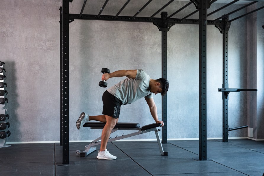 1. Nosta oikea polvi ja kämmen penkille, käsi penkillä tulee pitää hartian alla ja täysin suorana.
