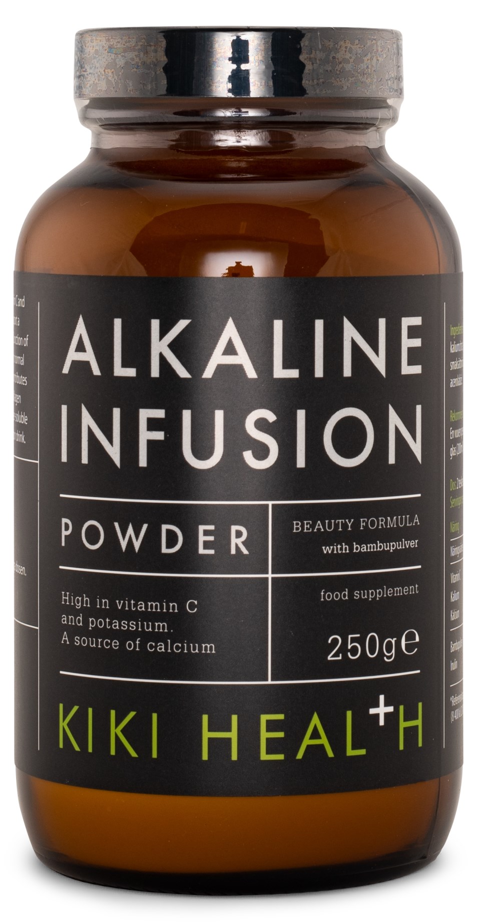 Kiki Health Alkaline Infusion on jauhe, joka sisältää sekoituksen C-vitamiinia ja mineraaleja. Näillä on positiivinen vaikutus ihon terveyteen ja ulkonäköön sekä hampaisiin ja luustoon. Jauhe sisältää piidioksidia, joka stimuloi kollageenin tuotantoa, tehden ihosta kiinteämmän, ja edistää terveiden hiusten ja kynsien kasvua. Se sisältää myös magnesiumia, kalsiumia ja kaliumia. Jauheella on hedelmäinen maku, ja se on helppo sekoittaa veteen, mehuun tai smoothieen.
