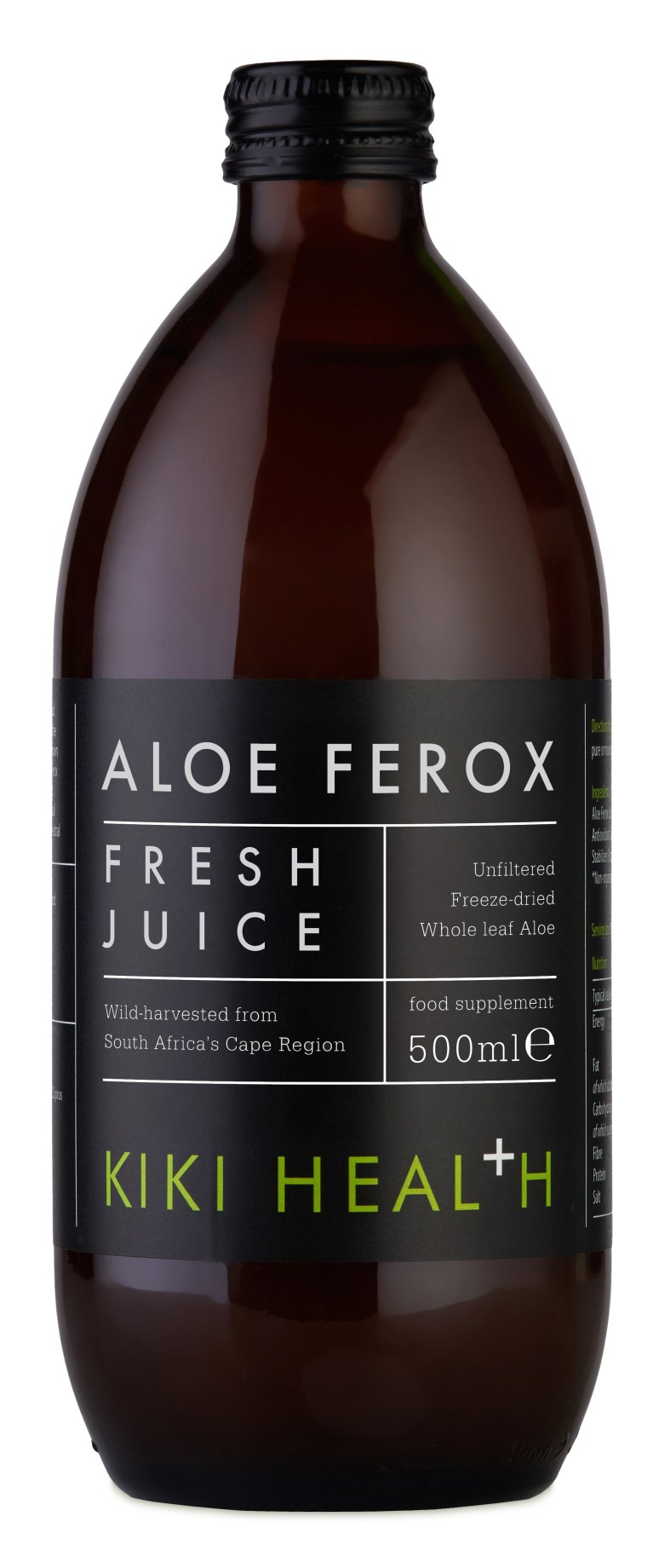 Kiki Health Aloe Ferox Juice on mehu, joka on peräisin Aloe Ferox -kasvista, robustista kasvista Etelä-Afrikan Cape-alueen villistä luonnosta. Yli 200 vuoden ajan tätä kasvia on käytetty puhdistustarkoituksissa. Aloe Ferox -kasvi tuottaa 20 kertaa enemmän katkeraa mehua kuin tunnetumpi Aloe Vera -kasvi. Koska sen lehdet ovat lisäksi vahvempia, ainesosa aloin ei pääse mehuun. Tämän seurauksena mehua ei tarvitse laimentaa eikä suodattaa, jolloin kaikki luonnolliset ainesosat säilyvät. Keskittämätön ja laimentamaton!