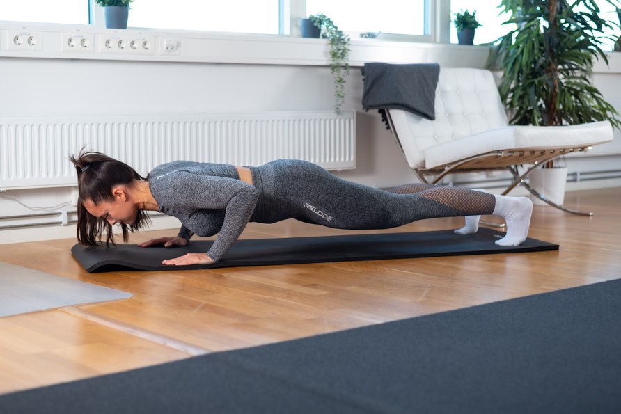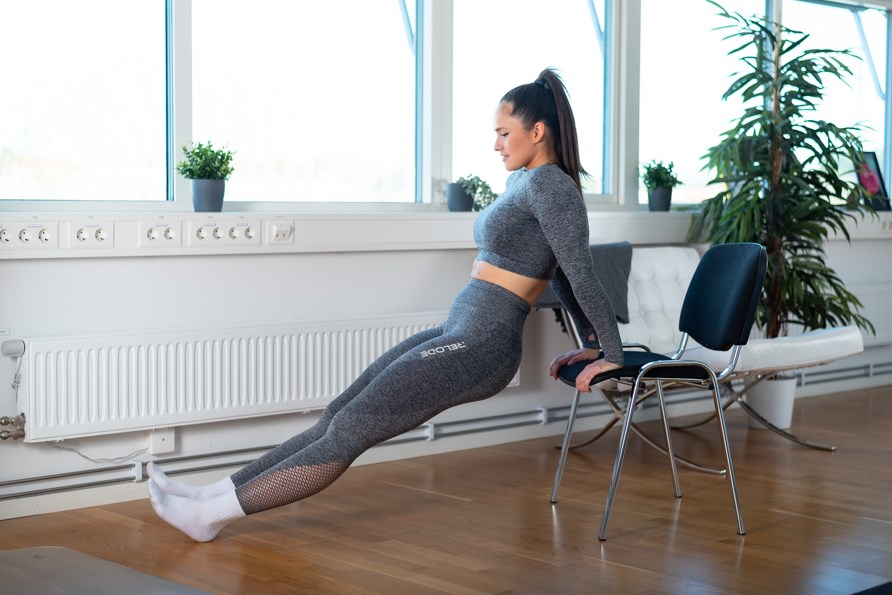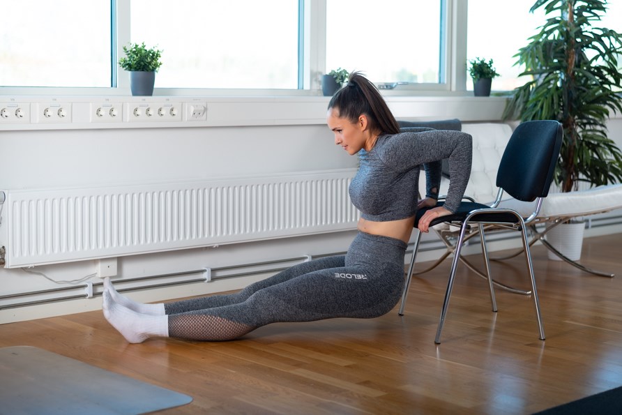 Vinkki! Kevennettyyn versioon voit pitää polvet maassa tai asettaa kädet tuolin tai sohvan reunalle. Halutessasi enemmän haastetta, aseta jalat tuolille tai sohvalle, muuta tempoa ja laskeudu hitaasti alas ja nouse räjähtävästi ylös.