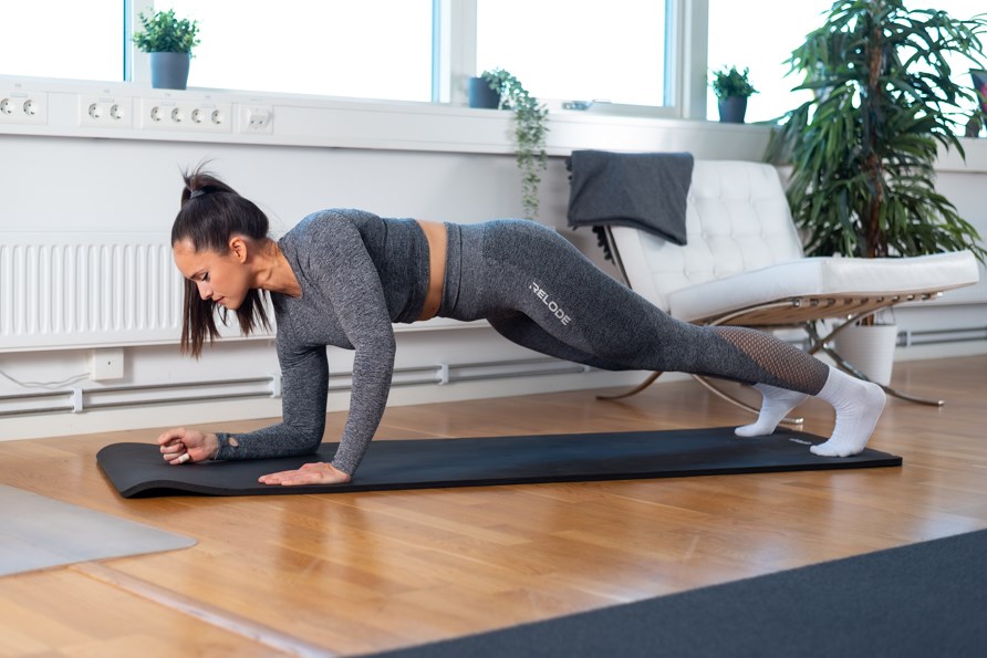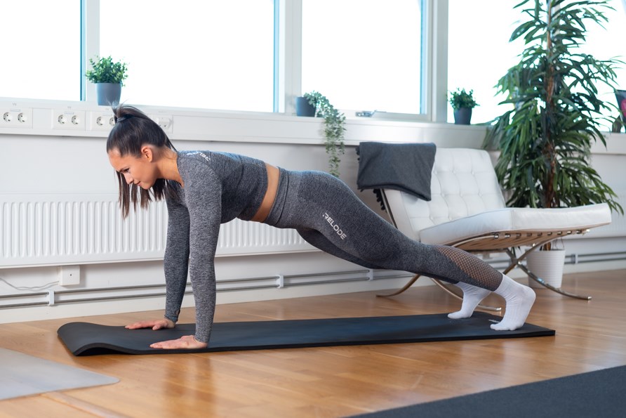 - Lankkuasennosta, jossa kyynärpäät ovat koukussa, nouse käsien avulla punnerrusasentoon