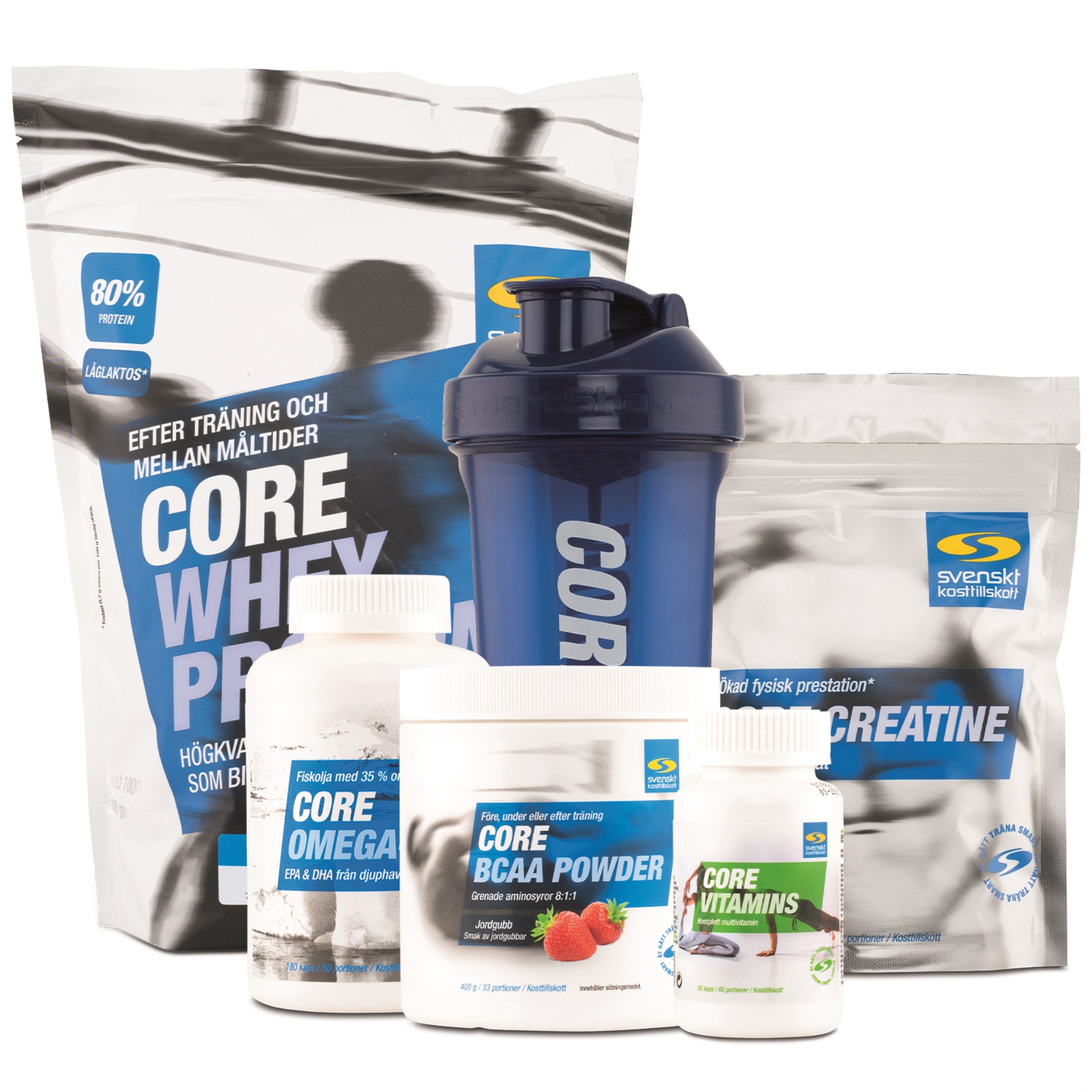 Paketin tuotteet sopivat täydellisesti otettavaksi ennen harjoittelua, sen aikana ja sen jälkeen. Aloita valmistautuminen kreatiinilla 30-60 minuuttia ennen harjoituksen alkua, ja täydennä Core BCAA:lla stimuloidaksesi lihaskasvua. Core Creatine edistää suorituskykyäsi harjoittelun aikana. BCAA:ta voi ottaa sekä ennen harjoittelua, sen aikana ja jälkeen, mutta aminohapot imeytyvät parhaiten, kun et ole syönyt muuta aivan lähiaikoina. Jos olet syönyt välipalaa vain tuntia ennen harjoitusta, suosittelemme ottamaan BCAA-juoman vasta harjoituksen jälkeen, kun varastot ovat tyhjentyneet. Harjoituksen jälkeen ja erityisesti illalla on hyvä täydentää lisäproteiinilla, jota lihakset voivat hyödyntää yöllä, kun et saa muuta ravintoa. Siksi voit juoda proteiinijuoman treenin jälkeen tai maukkaana iltapalana.