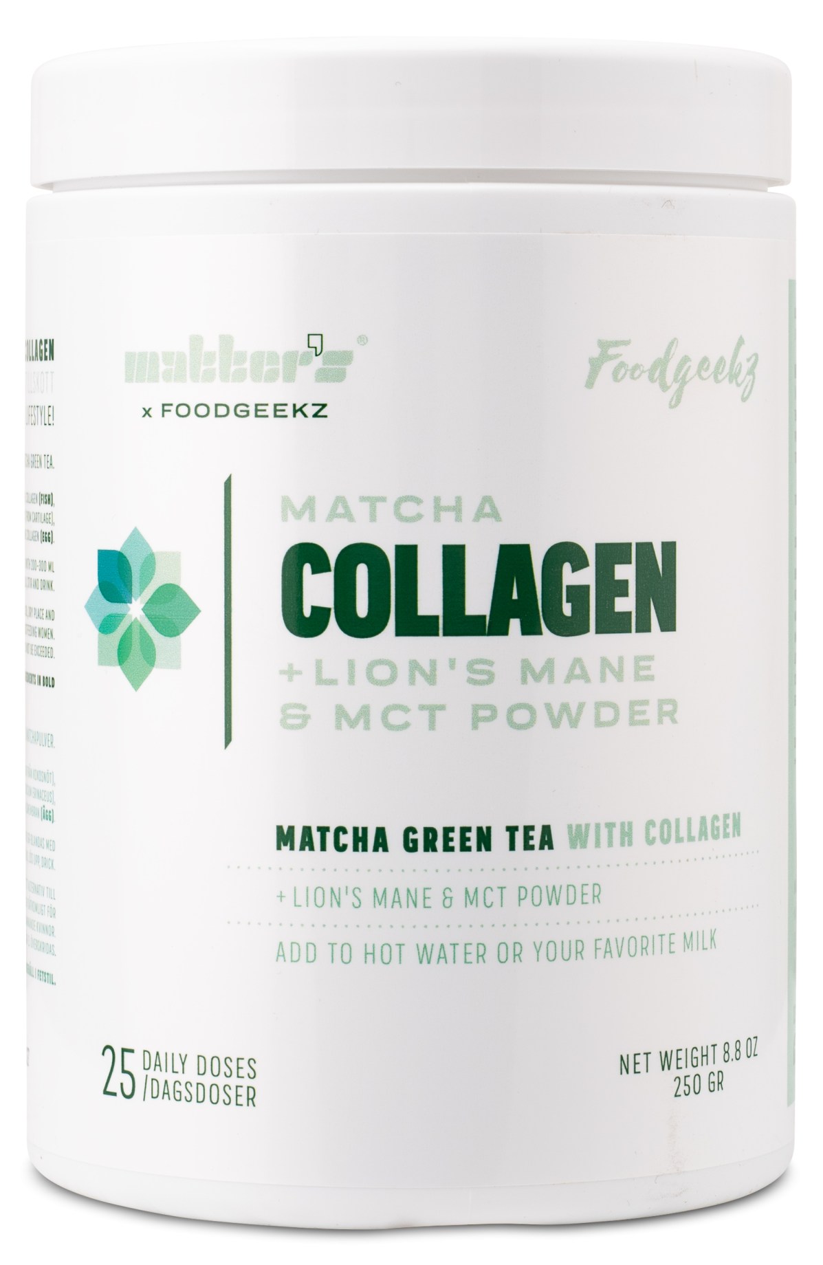 Matters Matcha Collagen on sekoitus kollageenia ja luomulaatuista japanilaista vihreää matcha-teetä, joka on rikas aminohappojen ja antioksidanttien suhteen. Jauhe sisältää kollageenityyppejä 1, 2, 3, 5 ja 10. Lisäksi tuotteeseen on lisätty leijonanharjasta ja MCT-jauhetta kookospähkinöistä. Sekoita jauhe kuumaan veteen tai maitoon ja nauti herkullisesta matchalatetesta! Sopii myös hyvin smoothieihin tai leivonnaisiin. Vapaa keinotekoisista makeutusaineista, gluteenista ja GMO:sta. Kehitetty yhteistyössä @Foodgeekz.se:n kanssa