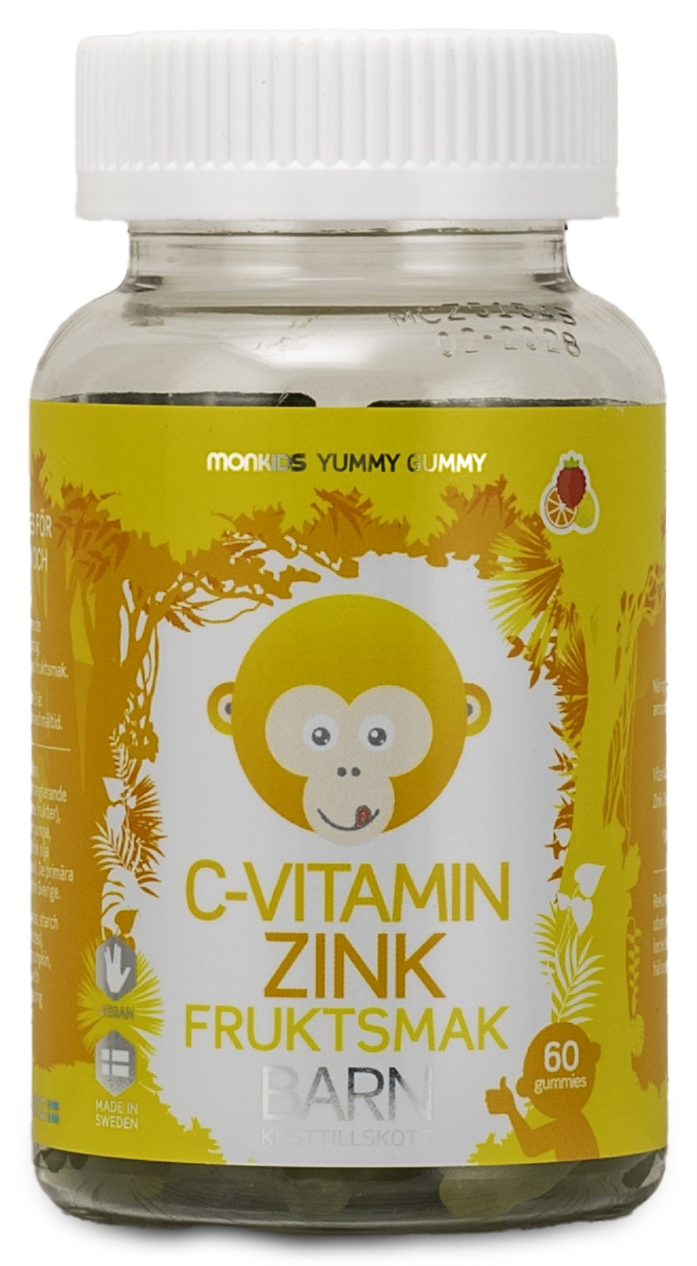 Monkids C-vitamiini + Sinkki on C-vitamiinia ja sinkkiä sisältävä ravintolisä maukkaiden pureskeltavien geelikarkkien muodossa. C-vitamiini ja sinkki edistävät immuunijärjestelmän normaalia toimintaa. Nämä pehmeät geelikarkit ovat apinan muotoisia. Niissä on luonnollinen hedelmäinen maku, ja ne sopivat sekä lapsille että aikuisille.