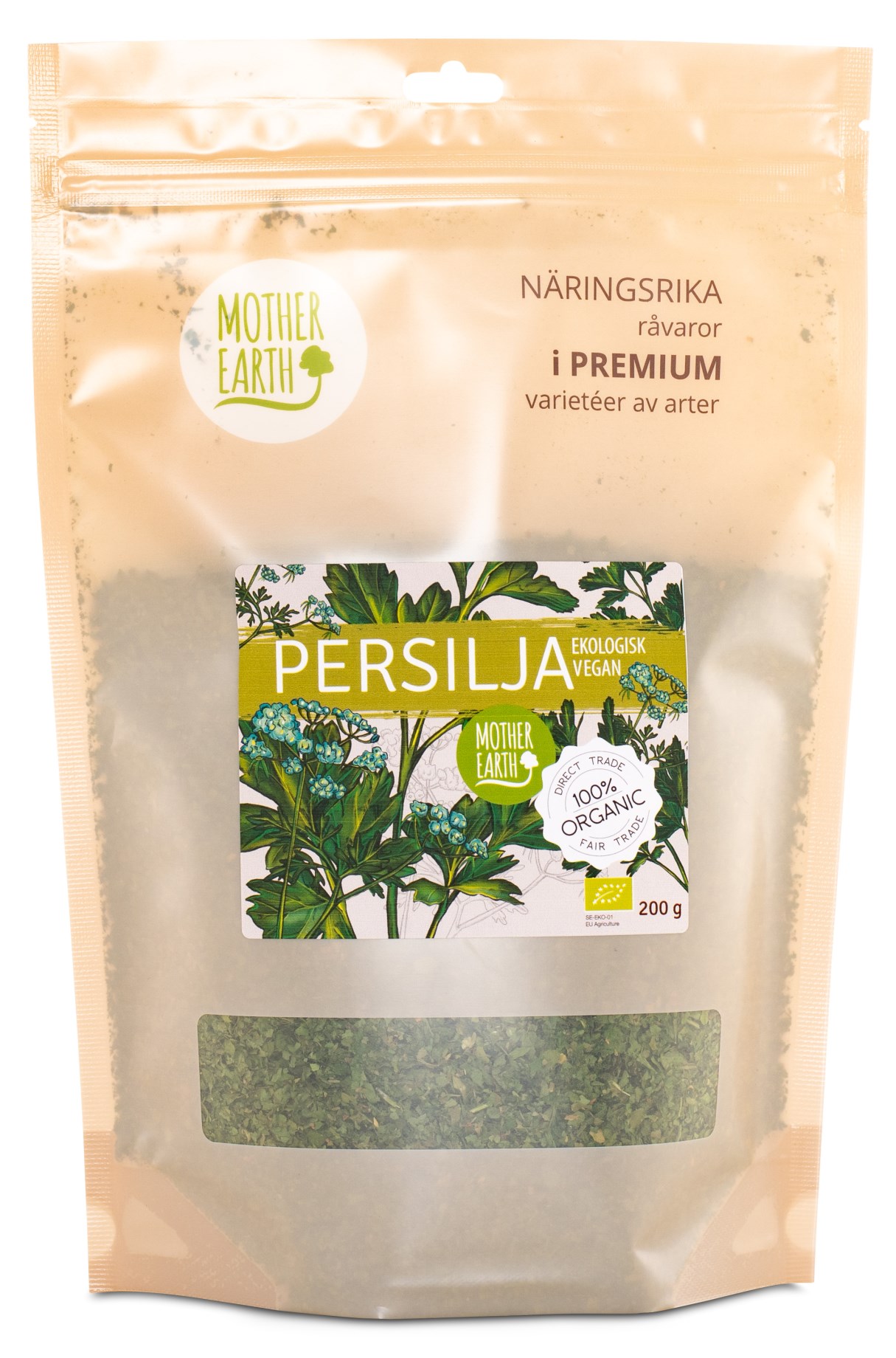 Mother Earth Persilja koostuu hakatusta kuivatusta persiljasta. Sen makea ja mausteinen maku sopii hyvin moniin erilaisiin ruokiin, kuten patoihin, pasta-annoksiin, salaatteihin. Pesilja-yrtti sopii myös hyvin yhteen perunoiden tai couscousin kanssa! Mother Earth Persilja on täysin luomu!