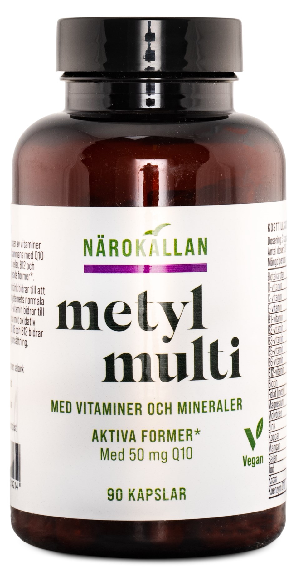 Närokällan Metyl Multi on multivitamiini ilman tarpeettomia lisäaineita. Se sisältää annoksen kaikkia vitamiineja ja mineraaleja yhdessä Q10:n kanssa energian tuottamiseksi soluille. B12-vitamiini ja folaatti ovat metyloituina muotoina, mikä mahdollistaa nopean ja tehokkaan imeytymisen. Voit käyttää Närokällan Metyl Multia, jos olet vegaani ja vältät eläinperäisiä lähteitä. Närokällanin tuotteet ovat puhtaita ja korkealaatuisia. Kapselit on valmistettu pullulanista, joka on lempeä ruoansulatusjärjestelmälle ja hajoaa nopeammin vatsassa.