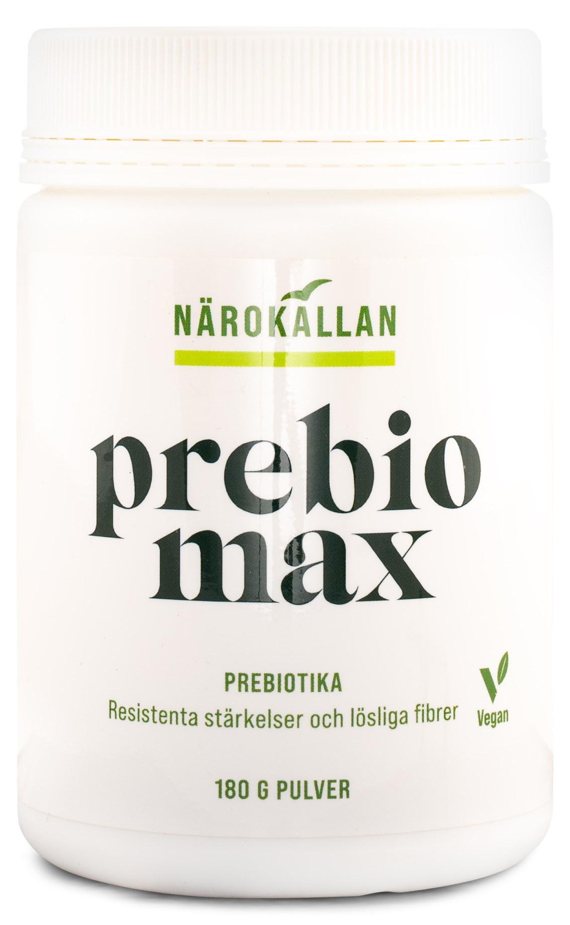 Närokällan PrebioMax on jauhe, joka sisältää luonnollisia kuituja muun muassa agavesta, akaasiasta, sikurista ja vihreästä banaanista. Näitä kuituja kutsutaan myös prebiooteiksi, ja ne toimivat ravintona suolistoflooramme omille bakteereille (probiooteille). Prebiootit kulkevat kestävästi ja elinkelpoisesti ruoansulatuskanavan läpi, eivätkä hajoa, vaan vaikuttavat suolistossa normaalin suoliston toiminnan edistämiseksi. Vatsaystävälliset maitohappobakteerit ovat osa immuunijärjestelmäämme ja suojaavat meitä haitallisilta bakteereilta. Joskus suoliston luonnollinen bakteerikanta voi häiriintyä, ja silloin prebiootit voivat olla hyödyllisiä suoliston tasapainon edistämiseksi, jotta se pääsee kukoistamaan. Närokällan PrebioMax on jauhe, jonka voit sekoittaa nesteeseen tai ripotella ruoan päälle. 1 ruokalusikallinen, 6 grammaa, on sopiva päivittäinen annos. PrebioMax on 100 % luonnollinen eikä sisällä lisäaineita.