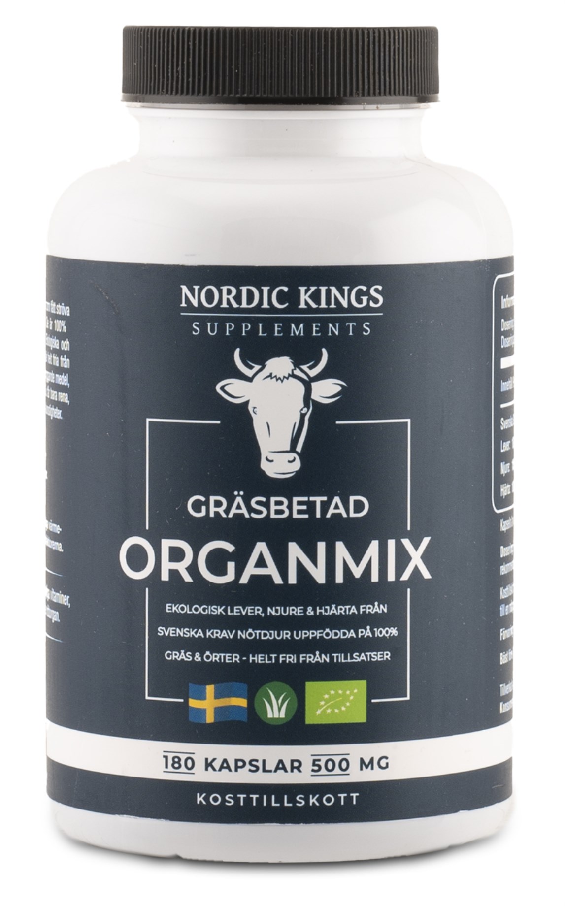 Nordic Kings Ruohoruokitun Naudan Sisäelinsekoitus Luomu on ravinteikas ravintolisä kätevissä kapseleissa, jotka sisältävät sekoituksen maksa-, munuais- ja sydänlihasta, jotka ovat peräisin nurmella laiduntavista ja KRAV-sertifioiduista naudoista. Eläimet kasvatetaan 100 % ruoholla ja yrteillä ilman viljarehuja, kuten soijaa, vehnää tai maissia. Tämä sisäelinsekoitus pakastekuivataan varovasti, jotta sen ravinteet säilyvät parhaalla mahdollisella tavalla. Ei sisällä antibiootteja, kasvuhormoneja, torjunta-aineita, allergeeneja, lisäaineita, täyteaineita tai sidosaineita – ainoastaan pakastekuivattua maksa-, munuais- ja sydänlihaa.