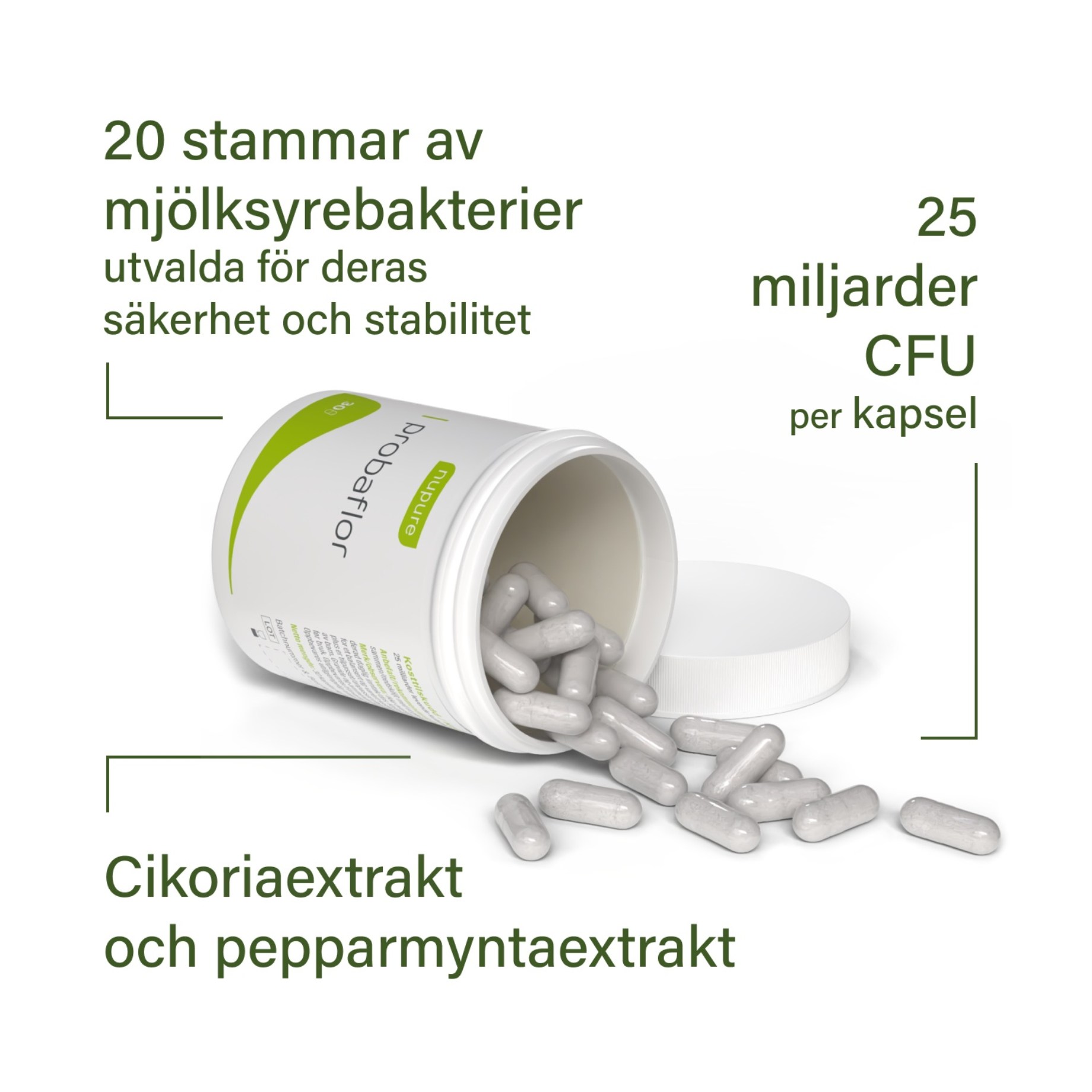 Nupure Probaflor sisältää 11 eri bakteerikannan yhdistelmän. Jokainen kapseli sisältää 20 miljardia CFU:ta (Colony Forming Unit), ja sen koostumus on suunniteltu tukemaan suoliston luonnollista mikrobiomia. Nämä maitohappobakteerit on sopeutettu viihtymään erilaisissa pH-ympäristöissä. Tuote on kehitetty EU:ssa ja sisältää myös inuliinia - prebioottista kuitua, joka edistää hyödyllisten suolistobakteerien kasvua.
