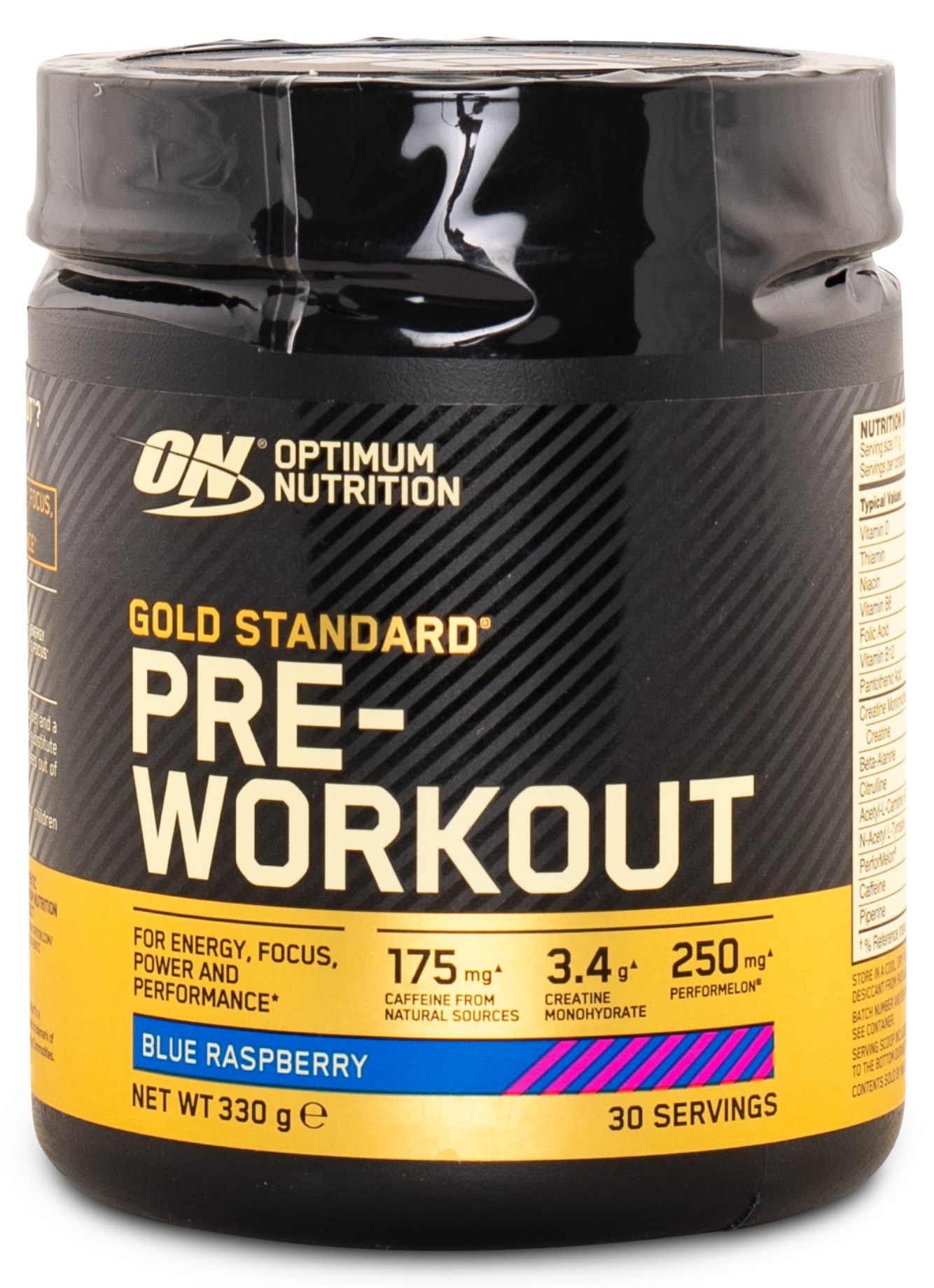 Optimum Nutritions tuotelinja Gold Standard kokoaa yhteen edistyneimmät lisäravinteet todella korkealaatuisella sisällöllä, jotta saavuttaisit parhaan mahdollisen hyödyn tuotteestasi kovassa fyysisessä rasituksessa. Tämä PWO sisältää tasapainoisen annoksen kofeiinia optimaaliseen keskittymiseen tavoitteena välttää kofeiinin ei-toivotut sivuvaikutukset. Kreatiinimonohydraatti tarjoaa kreatiinin vaikutukset, jotka yhdessä lyhytkestoisesti ja korkeatehoisesti harjoiteltaessa voivat kasvattaa fyysistä suorituskykyä toistuvissa liikkeissä. Suositut ainesosat sitrulliini ja beta-alaniini tekevät Optimum Nutrition Gold Standard Pre-Workoutista erinomaisen tuotteen otettavaksi ennen treeniä.