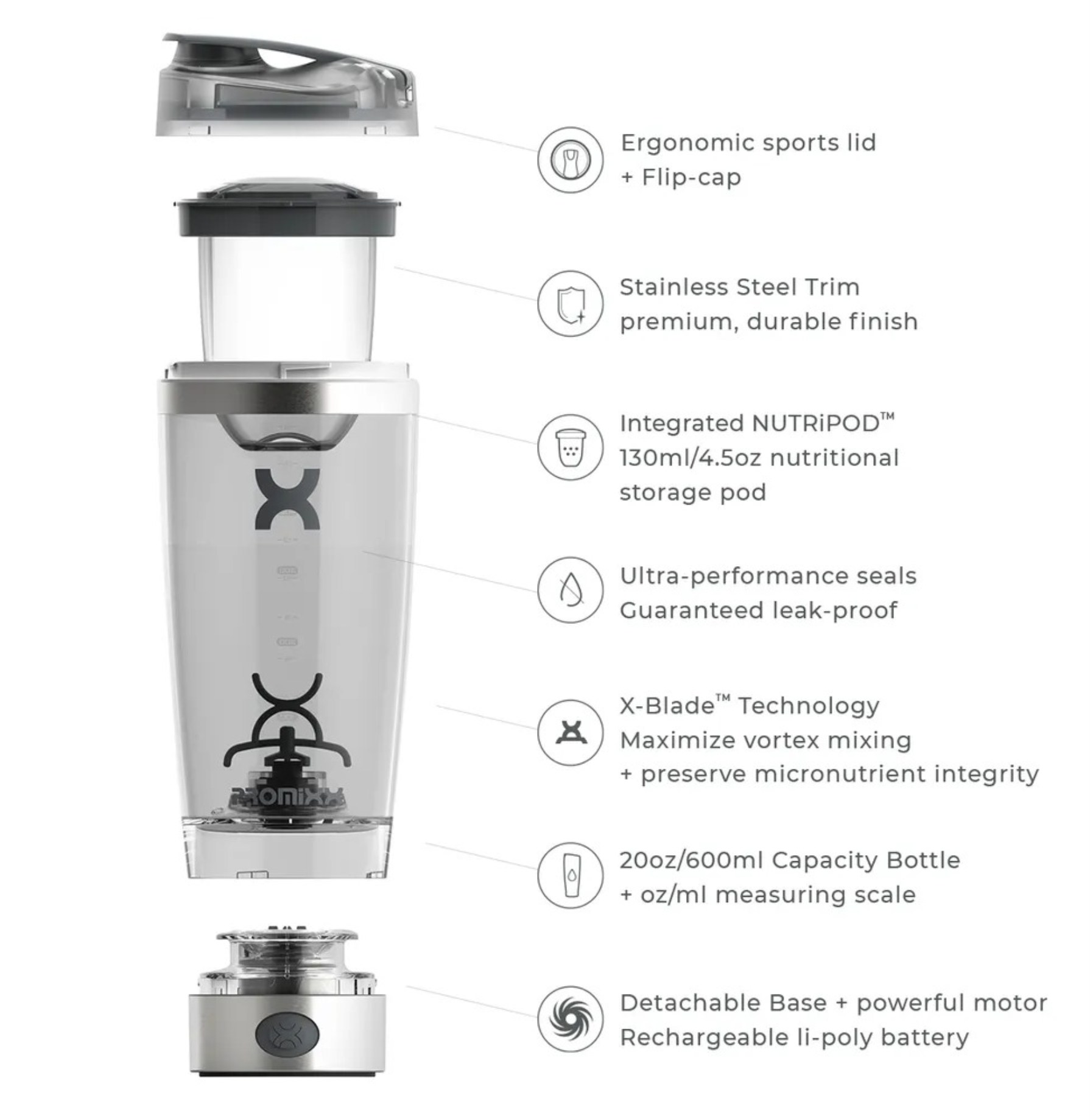 Promixx Pro Electric Shaker on tehokas sähköinen shaker, joka sekoittaa juomasi tasaisesti ja paakuttomasti - vain yhdellä napin painalluksella. Vortex Mixing Technology -sekoitusteknologian ansiosta saat täydellisen koostumuksen joka kerta, sekoititpa sitten proteiinia, PWO:ta tai palautusjuomaa. Pullo on kestävä, vuotamaton ja hajunkestävä. Siinä on ergonominen urheilukansi ja integroitu Nutripod, joka on täydellinen ratkaisu jauheen säilyttämiseen, kunnes on aika sekoittaa juomasi. Moottoriosa ladataan helposti mukana tulevalla USB-C:llä ja antaa jopa 90 sekoitusta yhdellä latauksella.