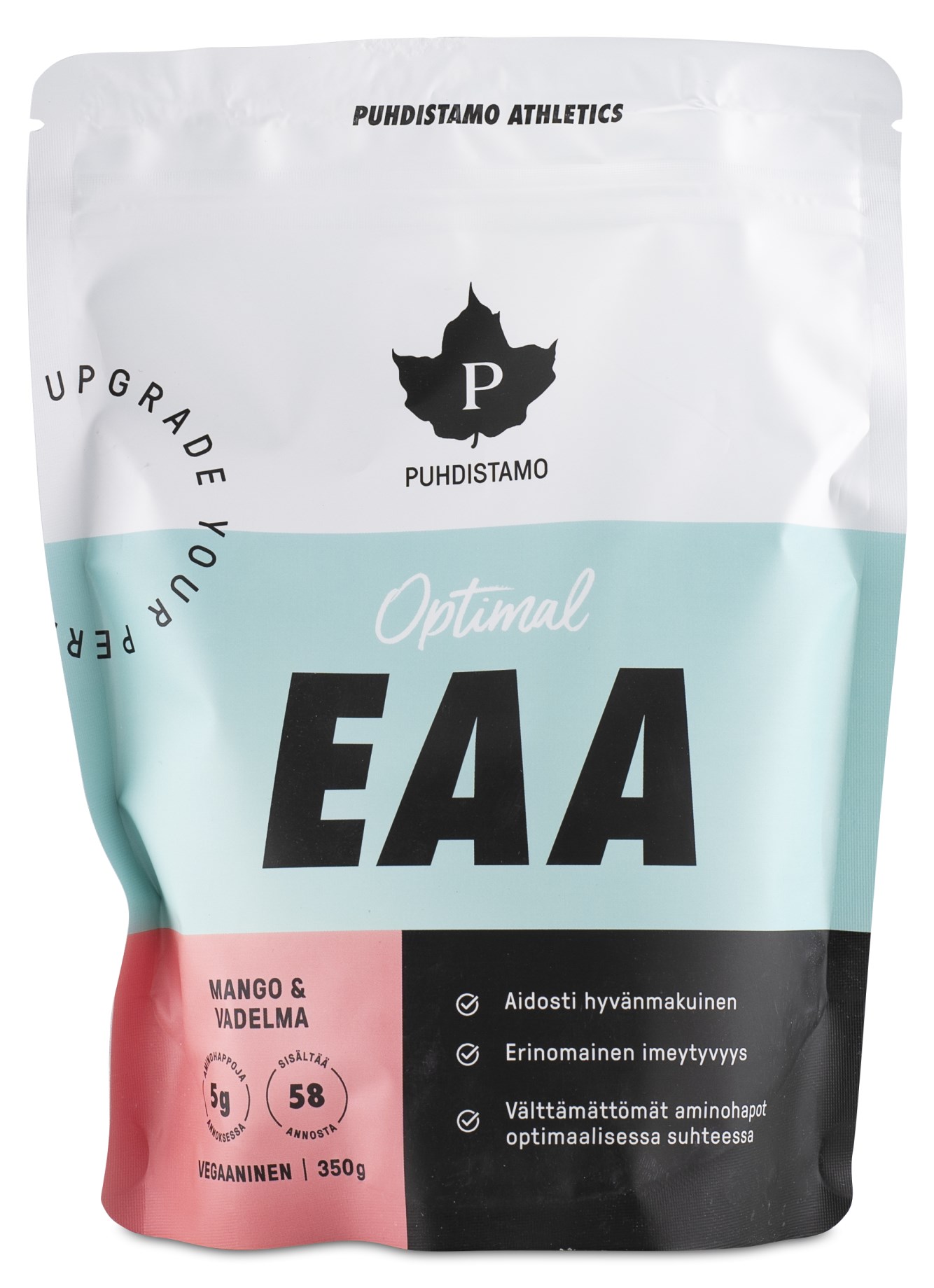 Puhdistamo Athletics EAA on aminohapposekoitus, joka sisältää kahdeksan välttämätöntä aminohappoa täydellisessä tasapainossa. Välttämättömät aminohapot ovat sellaisia, joita keho ei voi tuottaa itse, mikä tekee niiden saannista ruokavalion kautta välttämätöntä. Aminohapot ovat vapaassa muodossa, mikä mahdollistaa niiden nopean ja tehokkaan imeytymisen kehossa. EAA:ta voi käyttää milloin tahansa päivän aikana, esimerkiksi välipalalla, sekä harjoituksen aikana ja sen jälkeen. Urheilijoille voi olla erityisen hyödyllistä täydentää ruokavaliotaan EAA:lla.