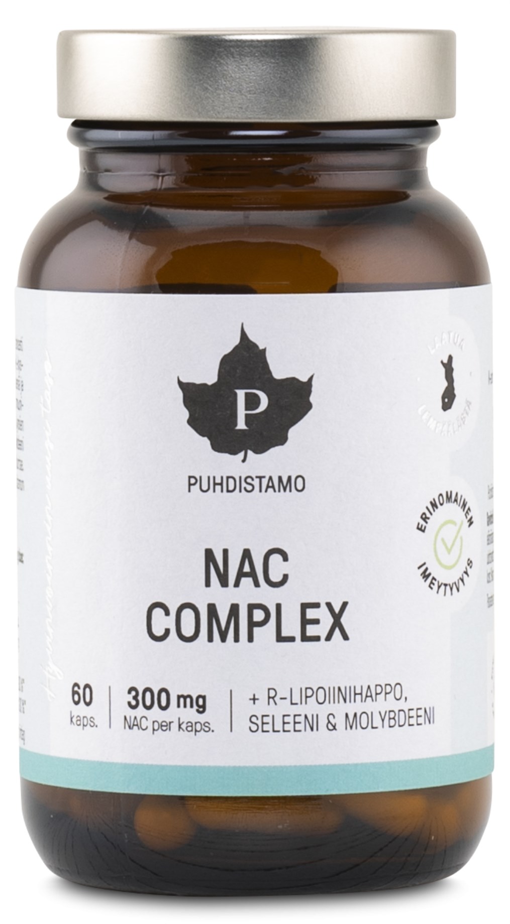 Puhdistamo NAC Complex on korkealaatuinen aminohappovalmiste, joka sisältää N-asetyyli-L-kysteiiniä (NAC) sekä aktiivista R-lipoiinihappoa, seleeniä ja molybdeeniä. Seleeni edistää immuunijärjestelmän normaalia toimintaa, auttaa ylläpitämään normaaleja hiuksia ja kynsiä sekä suojaa soluja oksidatiiviselta stressiltä. Molybdeeni edistää rikkipitoisten aminohappojen normaalia aineenvaihduntaa. Yhdistä mielellään NAC Complex C-vitamiinilisän kanssa.