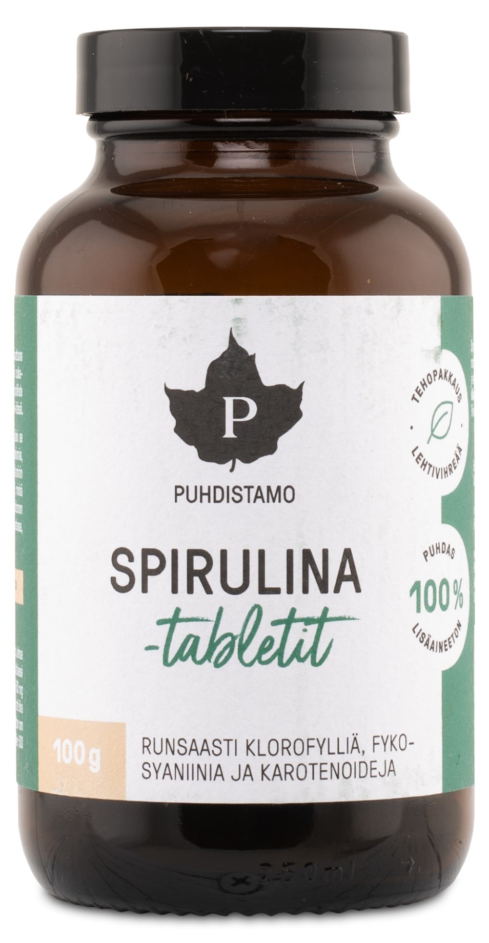 Puhdistamo Spirulina Tabletit on ravintolisä, joka sisältää sinivihreää levää nimeltä spirulina. Levä on klorofyllipitoista, mikä antaa kasveille niiden vihreän värin. Spirulinan painosta yli 60 % on proteiinia, mutta levä on myös rikas aminohappoja, vitamiineja ja mineraaleja kohtaan. On hyvä aloittaa spirulinan käyttö vähitellen ottamalla muutama tabletti päivässä ja sitten säätää annostusta tarpeesi mukaan. Jokainen tabletti sisältää 500 mg spirulinaa.