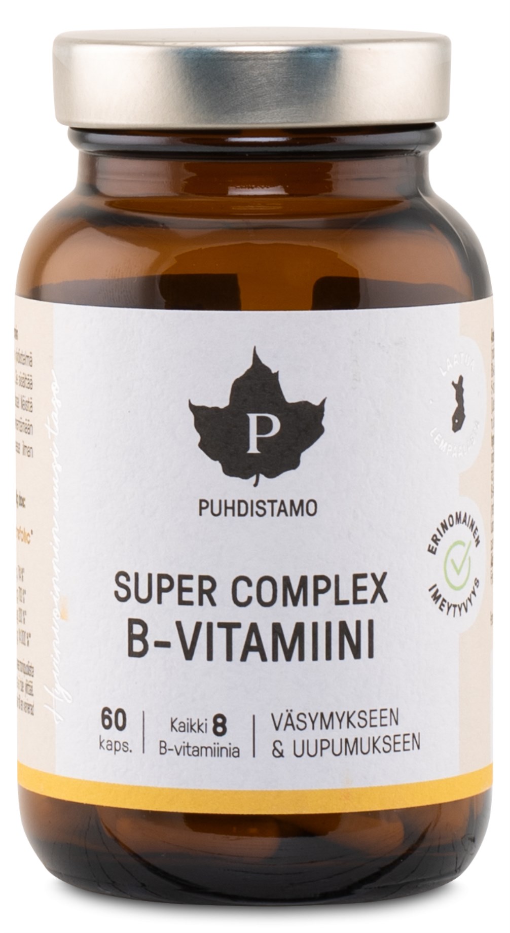 Puhdistamo Super Complex B-vitamiini sisältää aktiivisia B-vitamiineja (B1, B2, B3, B5, B6, B7, B9 ja B12) yhdessä ja samassa kapselissa. Niasiini, tiamiini, riboflaviini, B6- ja B12-vitamiinit edistävät hermoston normaalia toimintaa. Nämä vitamiinit edistävät myös normaalia energia-aineenvaihduntaa ja auttavat vähentämään väsymystä ja uupumusta. B9-vitamiinilla, myös foolihappona tunnetulla, on tärkeä rooli solujen jakautumisessa.