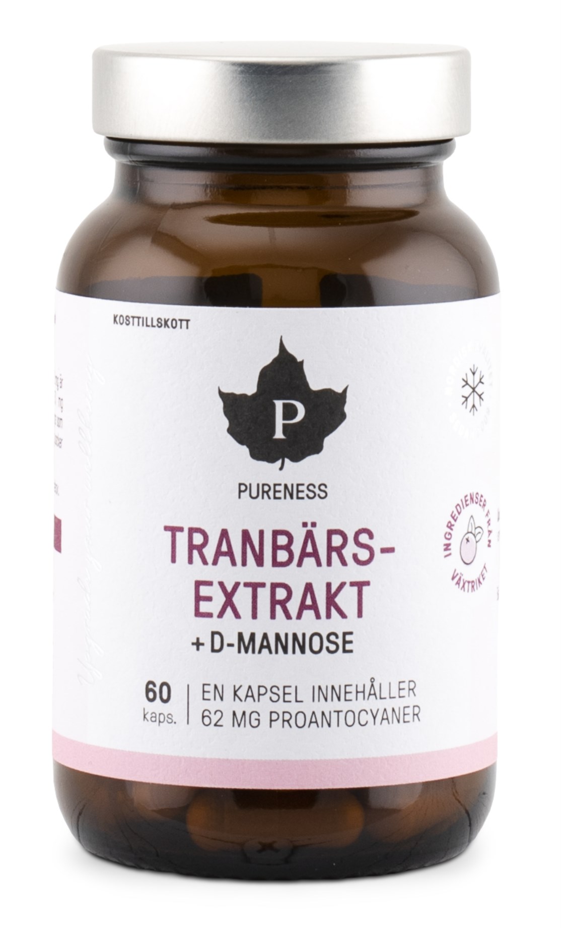 Pureness Karpalouute + D-mannoosi sisältää 250 mg karpalouutetta, josta 62 mg on proantosyanidiineja. Lisäksi jokainen kapseli sisältää 250 mg D-mannoosia. D-mannoosia esiintyy hedelmissä ja marjoissa, ja se on luonnollinen sokeri, jota on myös joissakin soluissa. Proantosyanidiinit ovat fenolisia yhdisteitä, joita esiintyy karpaloissa ja jotka ovat osa marjojen punaista väripigmenttiä. Pureness Karpalouute + D-mannoosi sopii sekä päivittäiseen käyttöön että satunnaiseen käyttöön tarpeen mukaan.