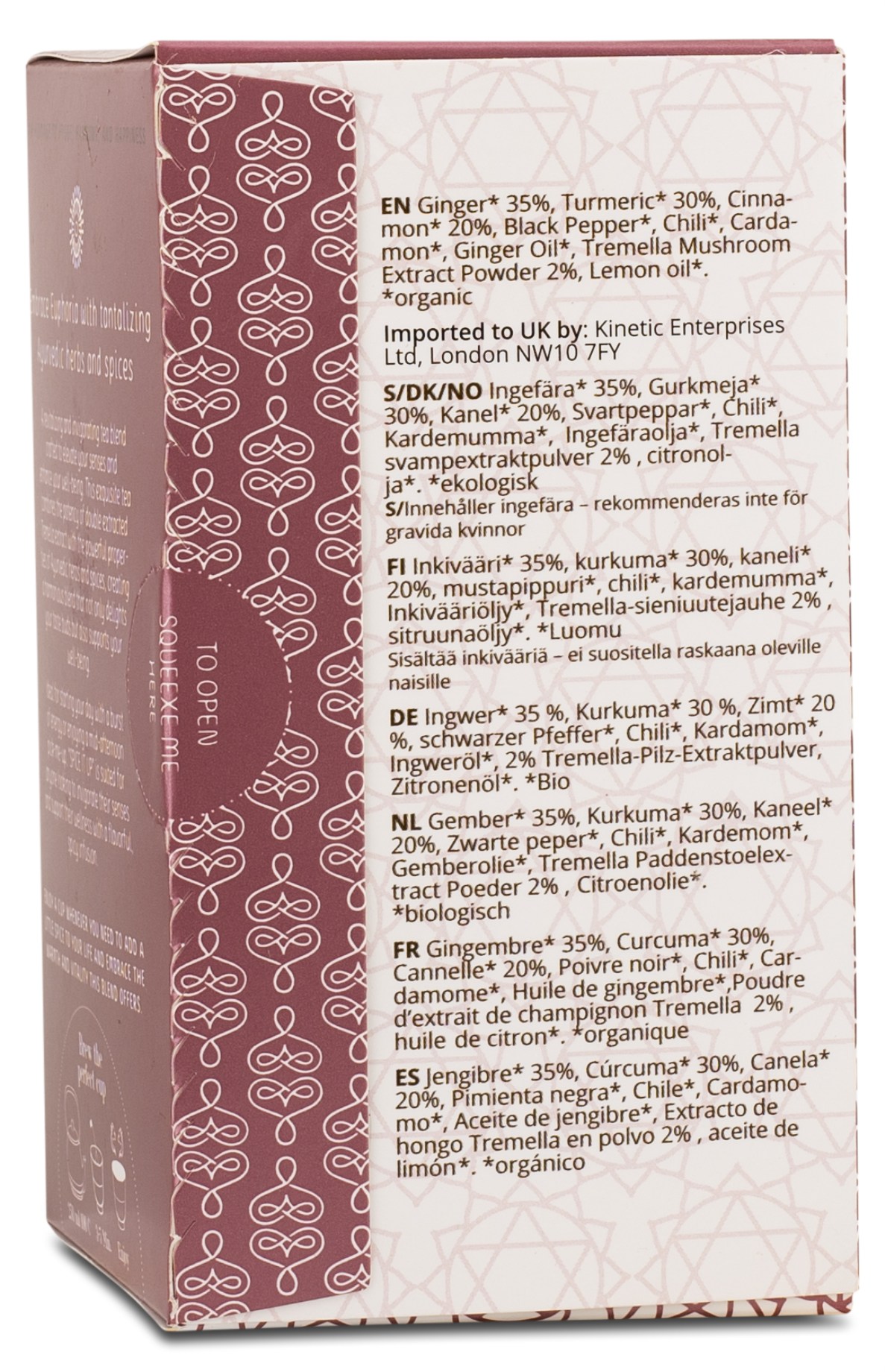 Rå Hygge Herbal Te Spice It Up Tremella on virkistävä yrttitee, joka sisältää tremellaa - perinteisessä kiinalaisessa lääketieteessä "kauneussienenä" tunnettua sientä. Spice It Up on kehitetty antamaan energiaa ja tukemaan hyvinvointiasi, ja se sisältää useita ayurvedisia yrttejä ja mausteita. Teellä on harmoninen maku, joka sopii sekä päivän pirteään starttiin että iltapäivän lataustaukoon.