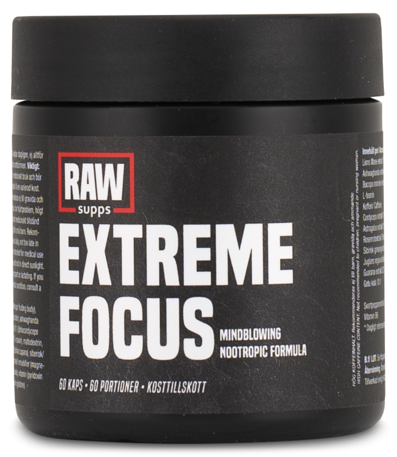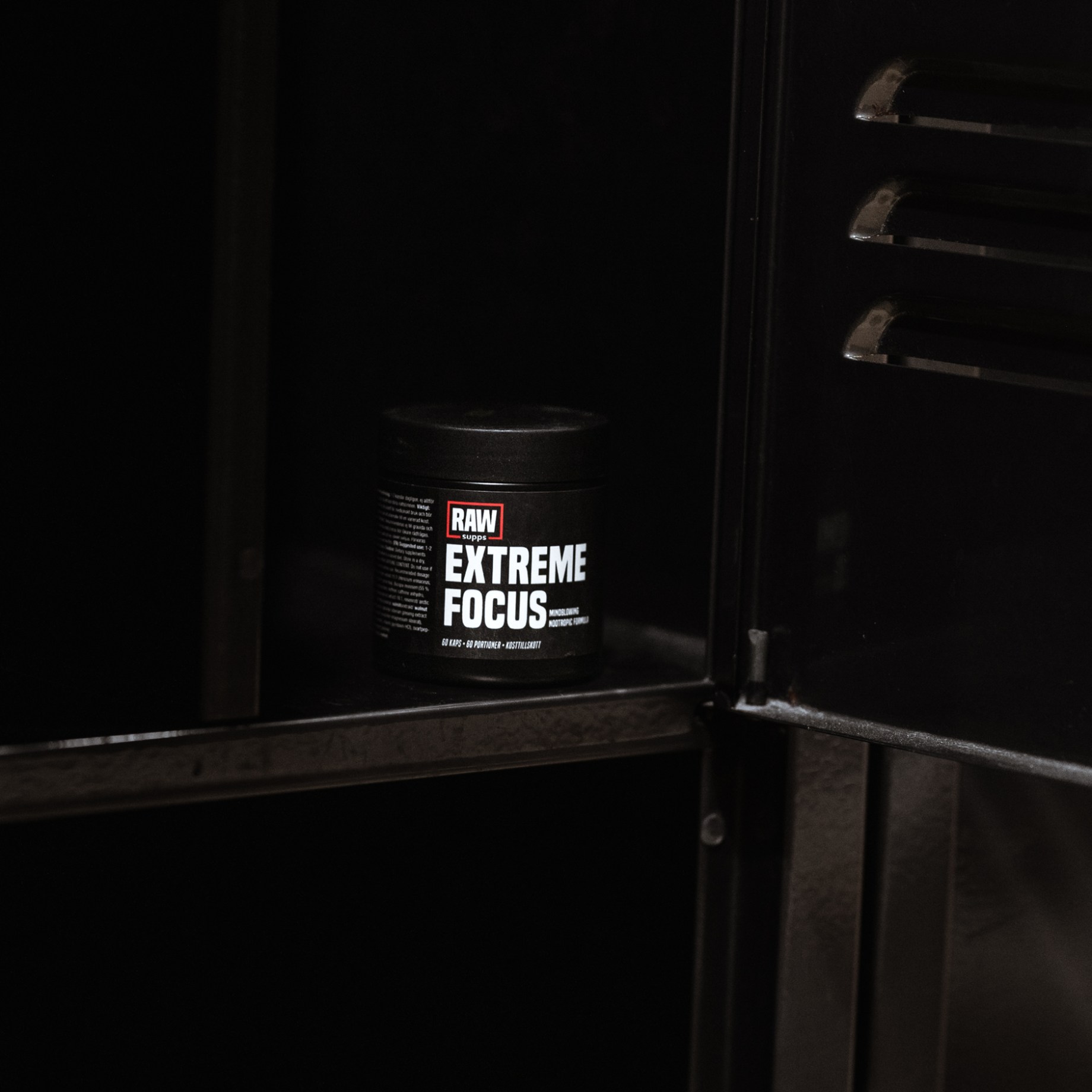RAW Extreme Focus on yhdistänyt aikamme puhutuimmat aineet valppauteen ja keskittymiseen: sekoitus kymmentä sieni- ja yrttiuutetta yhdessä kofeiinin, L-teaniinin, B6-vitamiinin ja piperinin kanssa. Kehitetty sinulle, joka haluat voittaa kaiken mahdollisen vastuksen salilla tai elämässä ylipäätänsä.